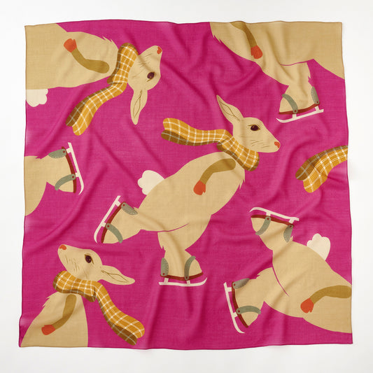 Superfine Merino Wool 'Skating Rabbits' ruby pink 正方形スカーフ