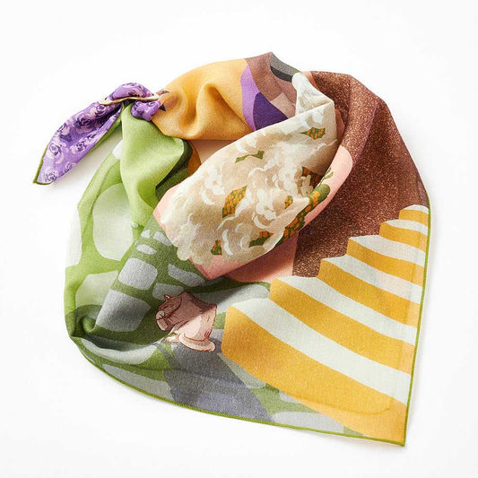 Silk Cotton 'Woodland Orchestra' Green 8リング付きミニスカーフ
