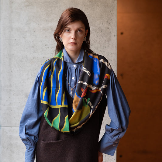 Scheduled to arrive in September! Silk & Merino Wool 'Halsham' gray x black loop scarf