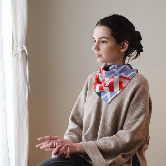 Japanese Printed Silk 'Orchestra' red&yellow&blue mini scarf with ring