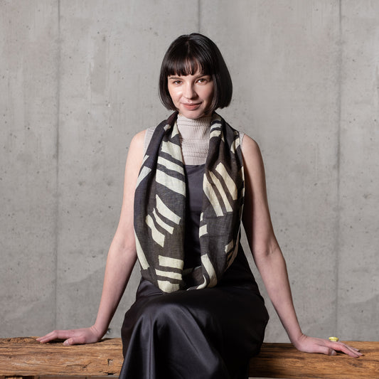 Scheduled to arrive in September! Silk & Merino Wool 'Halsham' gray x black loop scarf