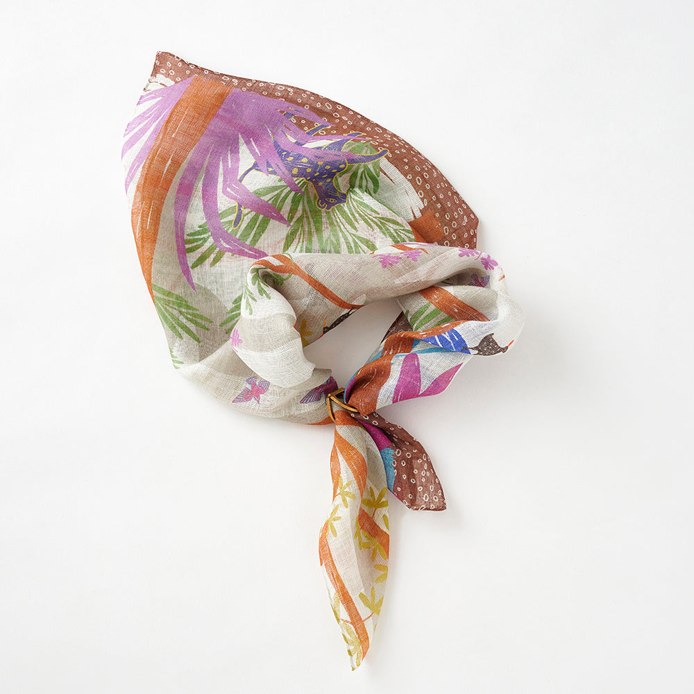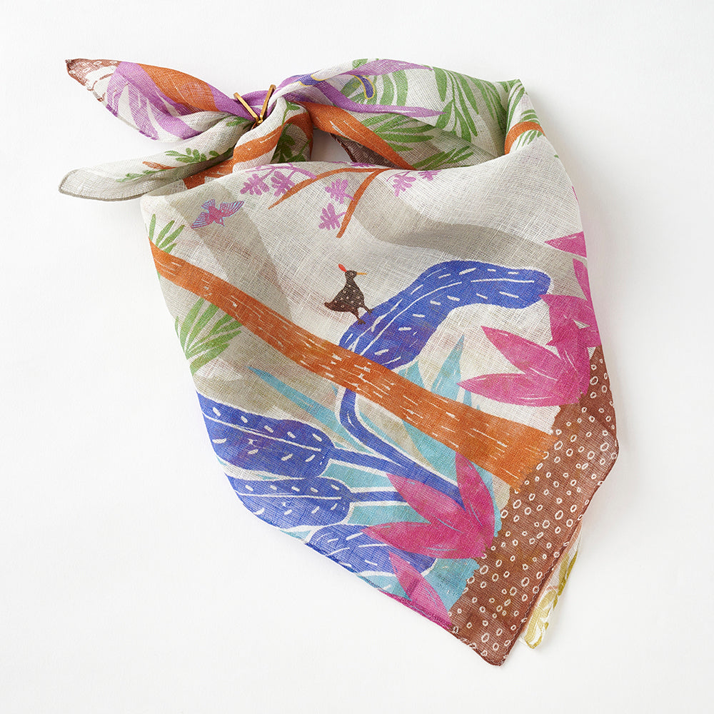 イラストレーションやパターンなどをミックスし、時にクラシックで、時にポップでクスッと笑ってしまうような、独自のアートスタイルを1枚のスカーフにしています。
