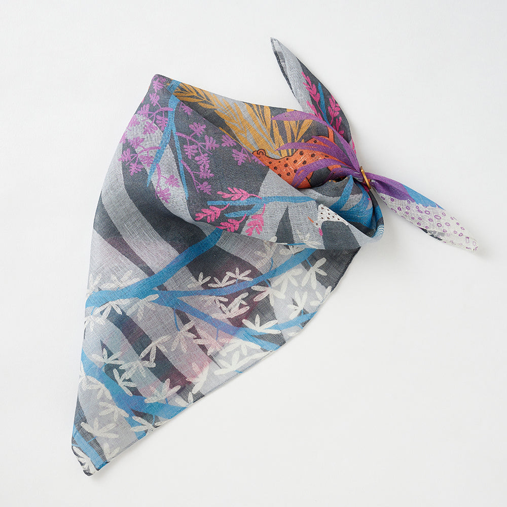 イラストレーションやパターンなどをミックスし、時にクラシックで、時にポップでクスッと笑ってしまうような、独自のアートスタイルを1枚のスカーフにしています。
