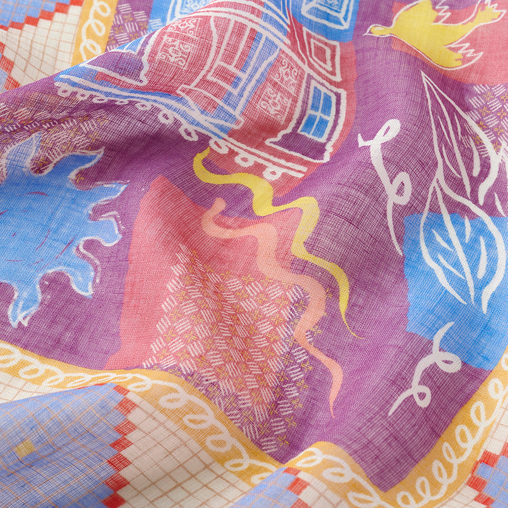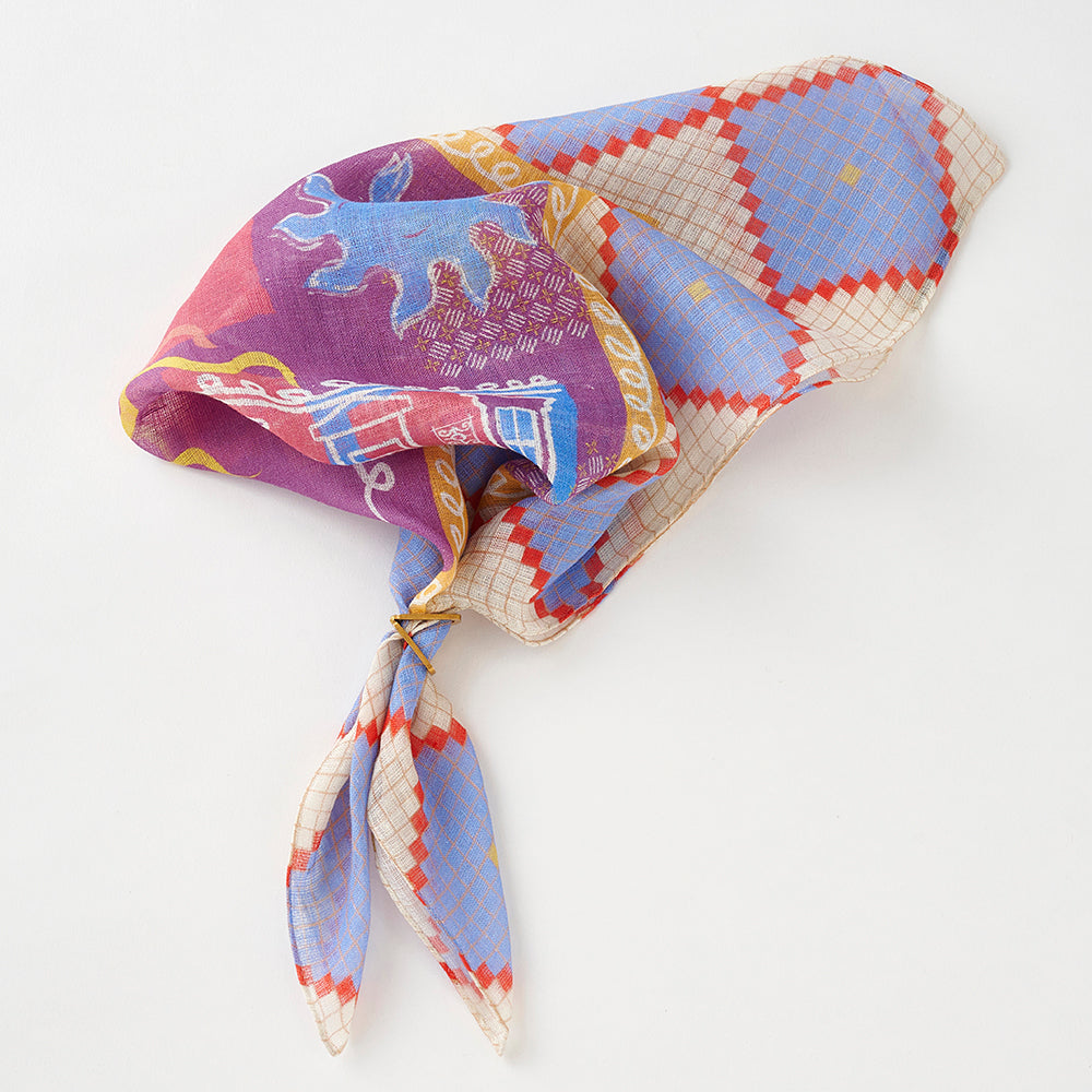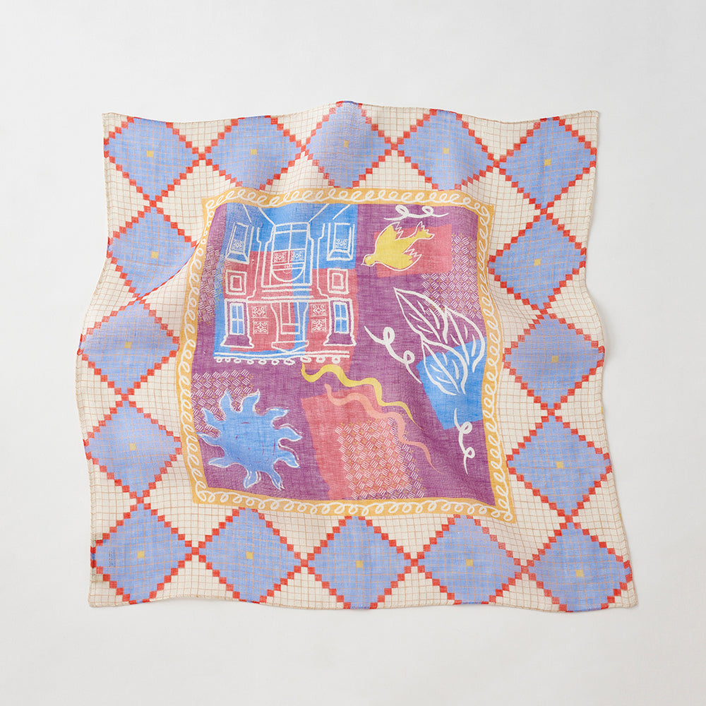イラストレーションやパターンなどをミックスし、時にクラシックで、時にポップでクスッと笑ってしまうような、独自のアートスタイルを1枚のスカーフにしています。