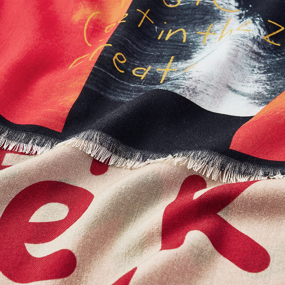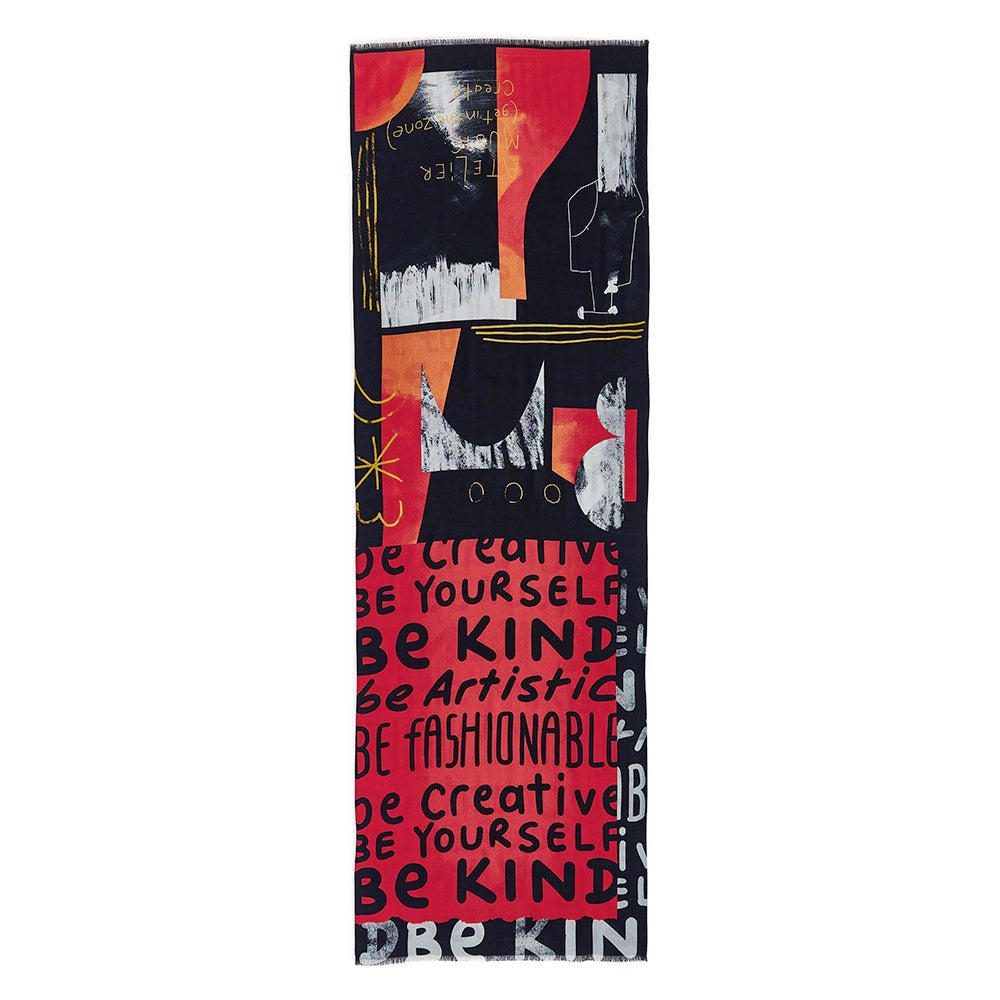 Mixing poetic text with abstract art gives the design a rock/artistic feel. David wanted to list slogans of encouragement that all begin with Be as an acknowledgement of motivation to create new things and and flourish as an artist. It is often hard to express one's self, so this scarf design can do that for you.