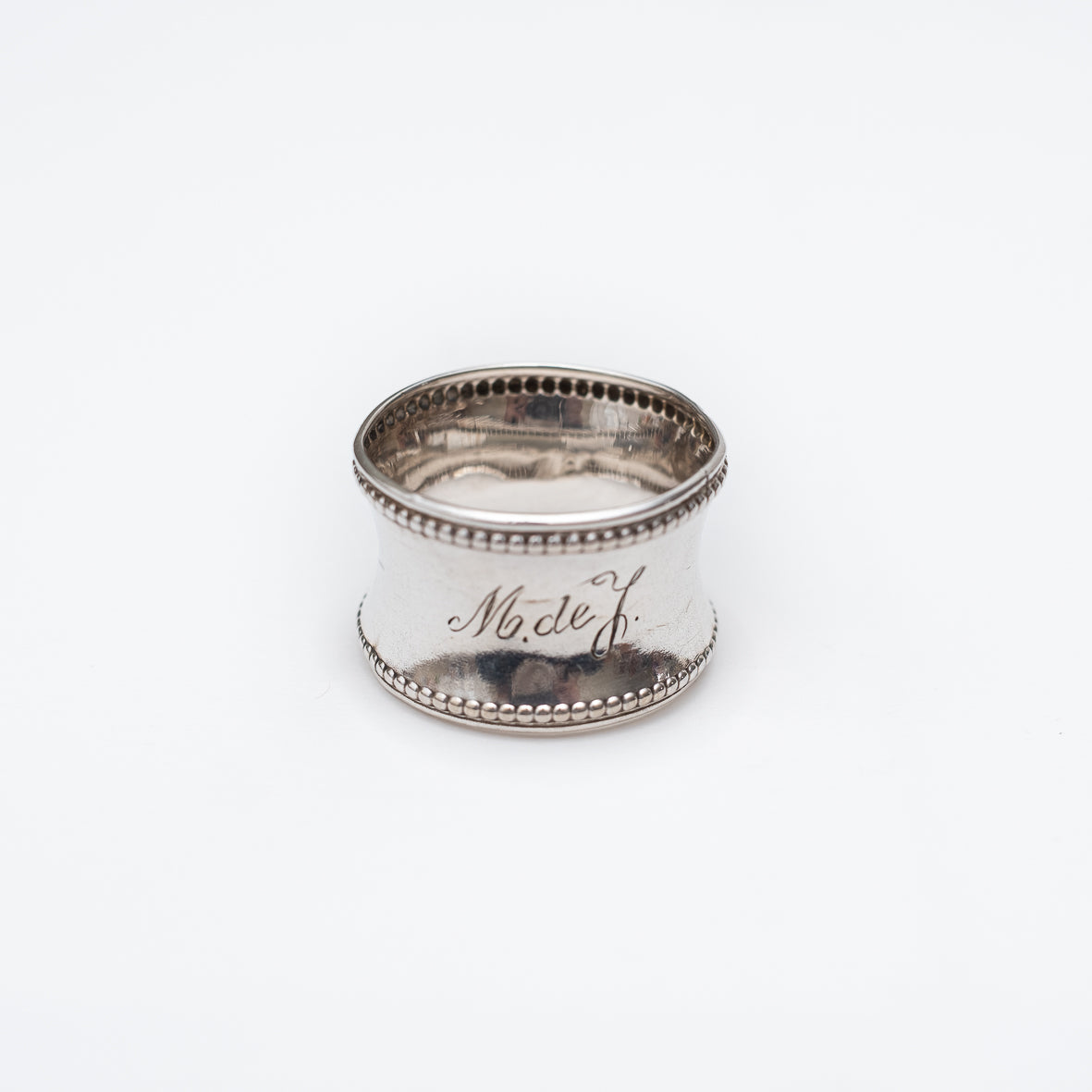 1840年~1900年の間に作られた(推定)の歴史ある、M.de Fとイニシャルが彫り込まれた、シンプルなボールチェーンの縁取りが美しいデザイン。