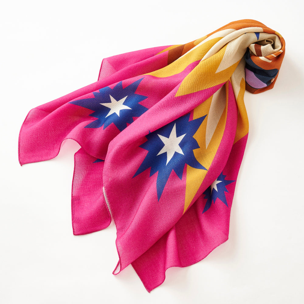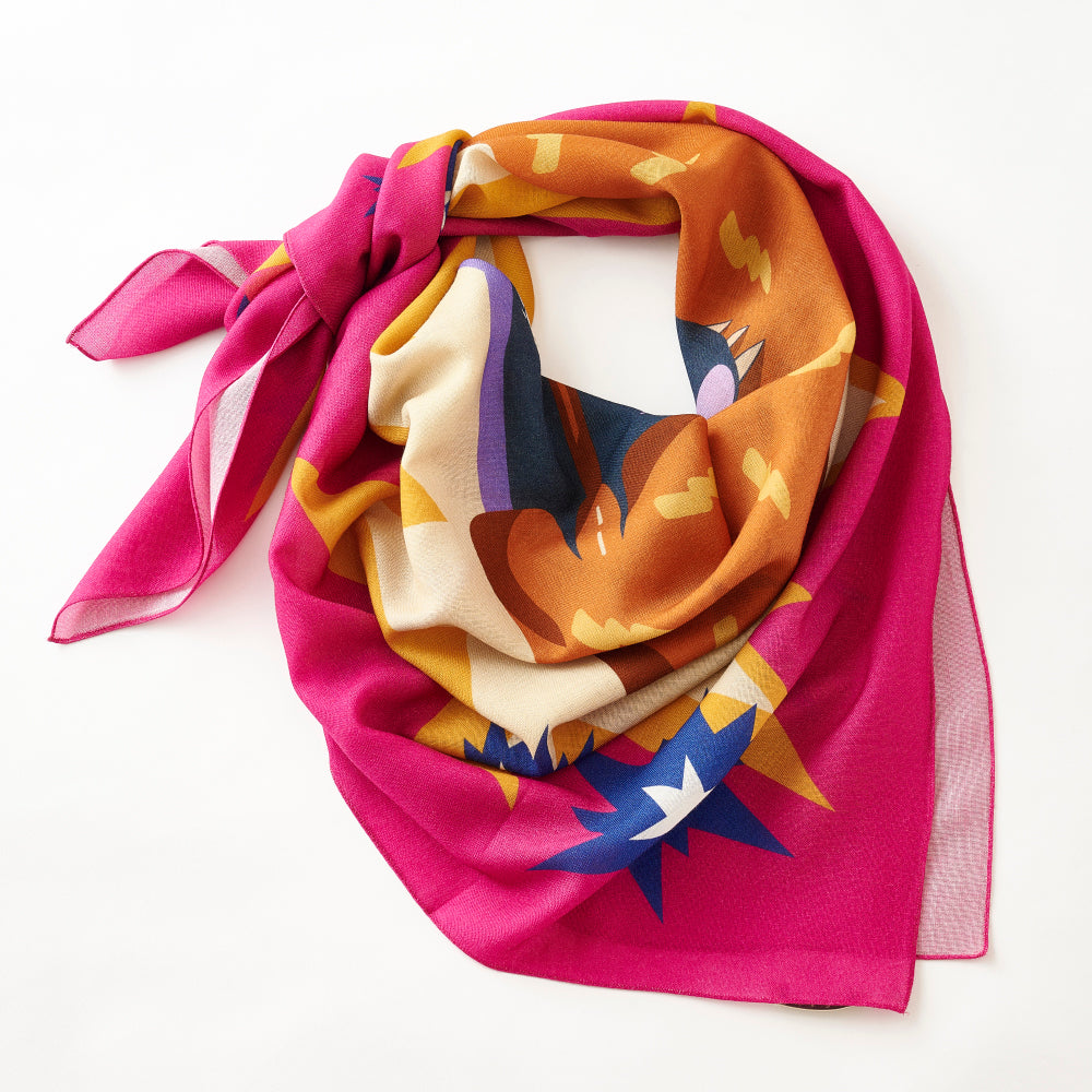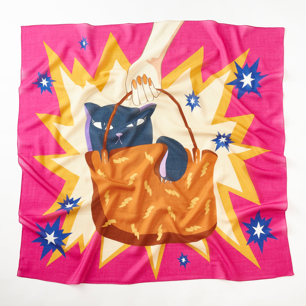 Japanese Merino Wool 'Mysterious Cats' Pink Square Scarf