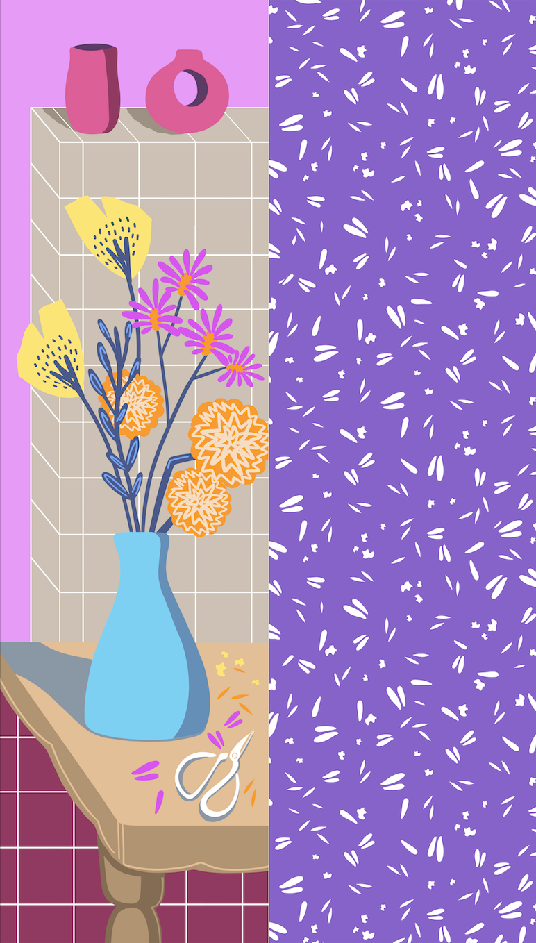 The concept behind this design is set in a florist's studio/shop. She has taken a break and you happen to walk in and see one of her beautiful flower arrangements. One side is a detailed illustration with bright flowers. The other side is more pattern based and when worn gives a a nice blend of illustration and pattern.