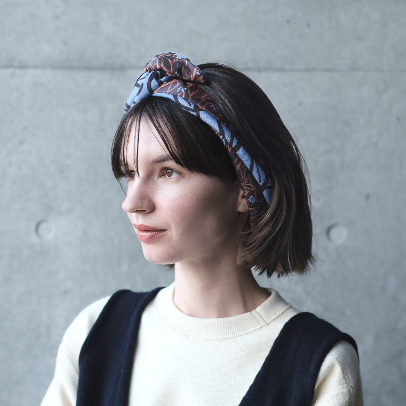 片面がシルク、もう片面がスカーフにも使われているスーパーファインメリノウールの生地を使った、リバーシブルのヘッドスカーフ。