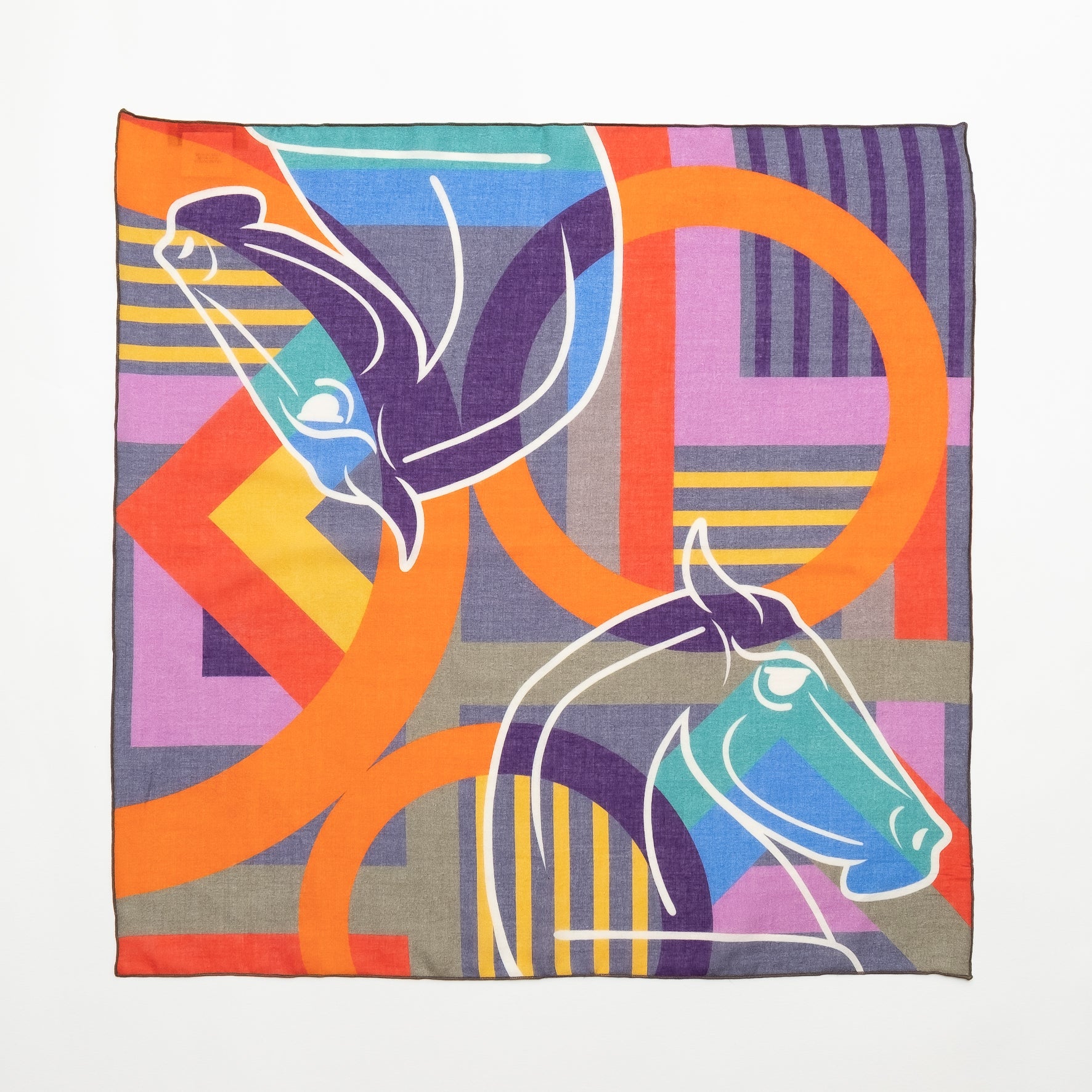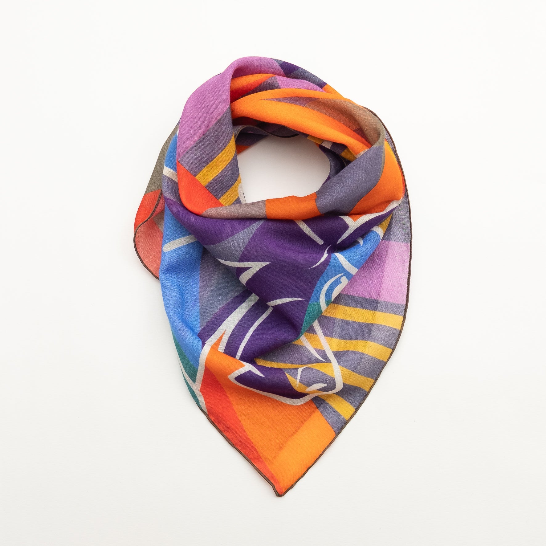イラストレーションやパターンなどをミックスし、時にクラシックで、時にポップでクスッと笑ってしまうような、独自のアートスタイルを1枚のスカーフにしています。