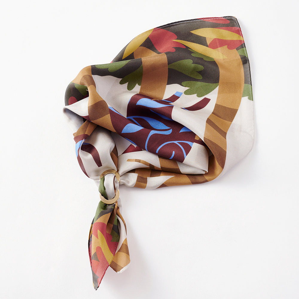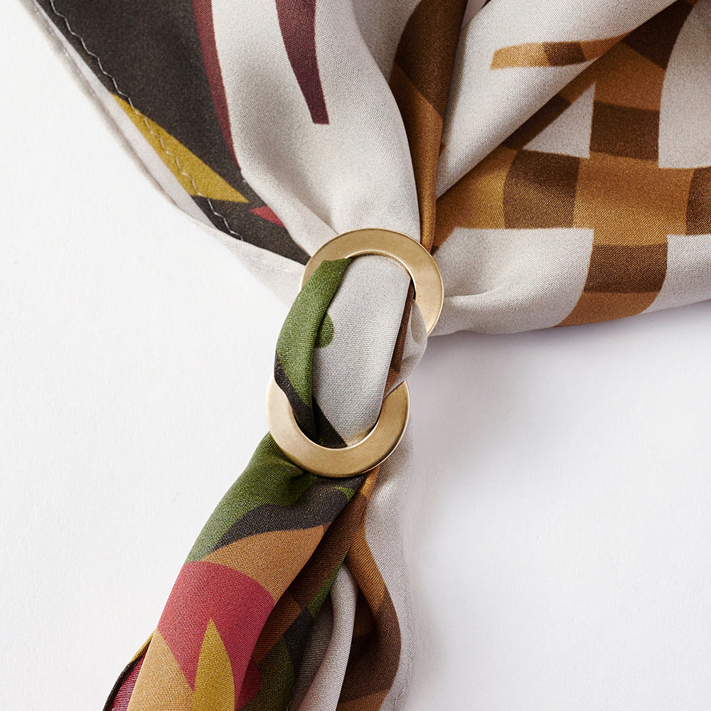 Une mini écharpe (foulard) en soie qui peut être arrangée avec un anneau de foulard en laiton.