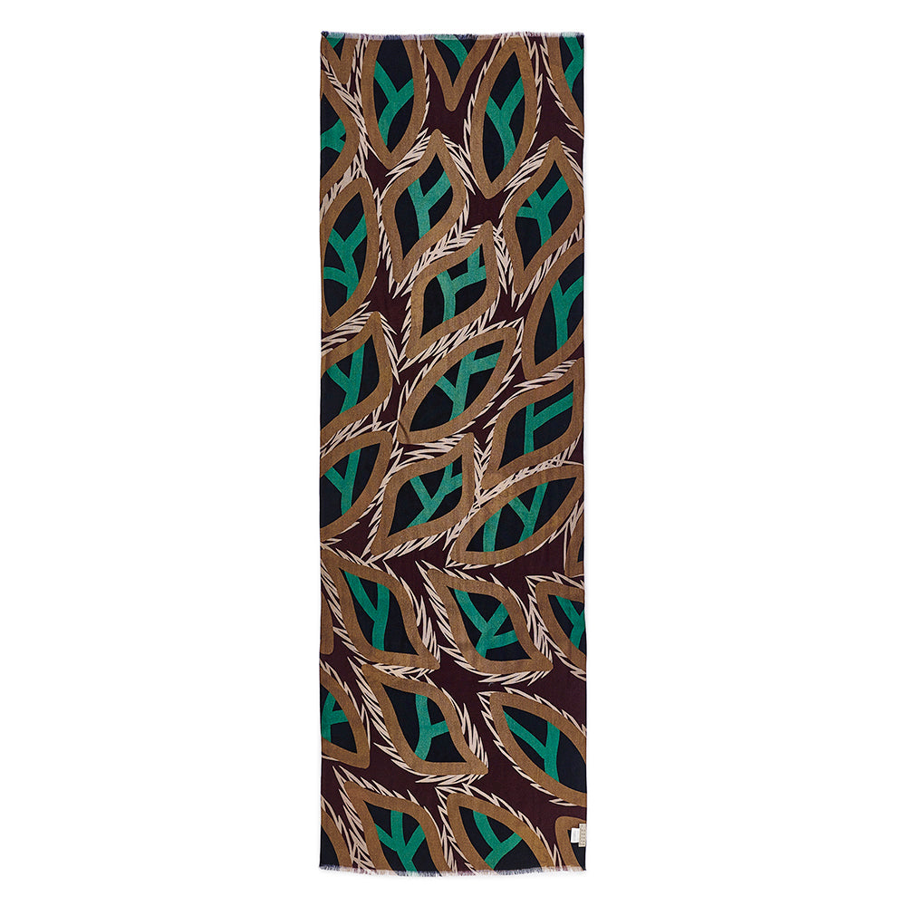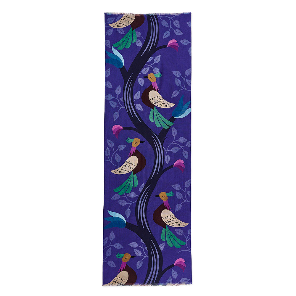 Imaginary and uniquely illustrated birds that resemble partridges can be seen sitting in a single tree. The trunk of the tree is purposely placed in the centre of the design to divide the design, while the branches act as separation points. Giving each bird their own framed sections. The backside of the scarf is a montage of feathers, that give the scarf a modern twist on the classic paisley pattern.