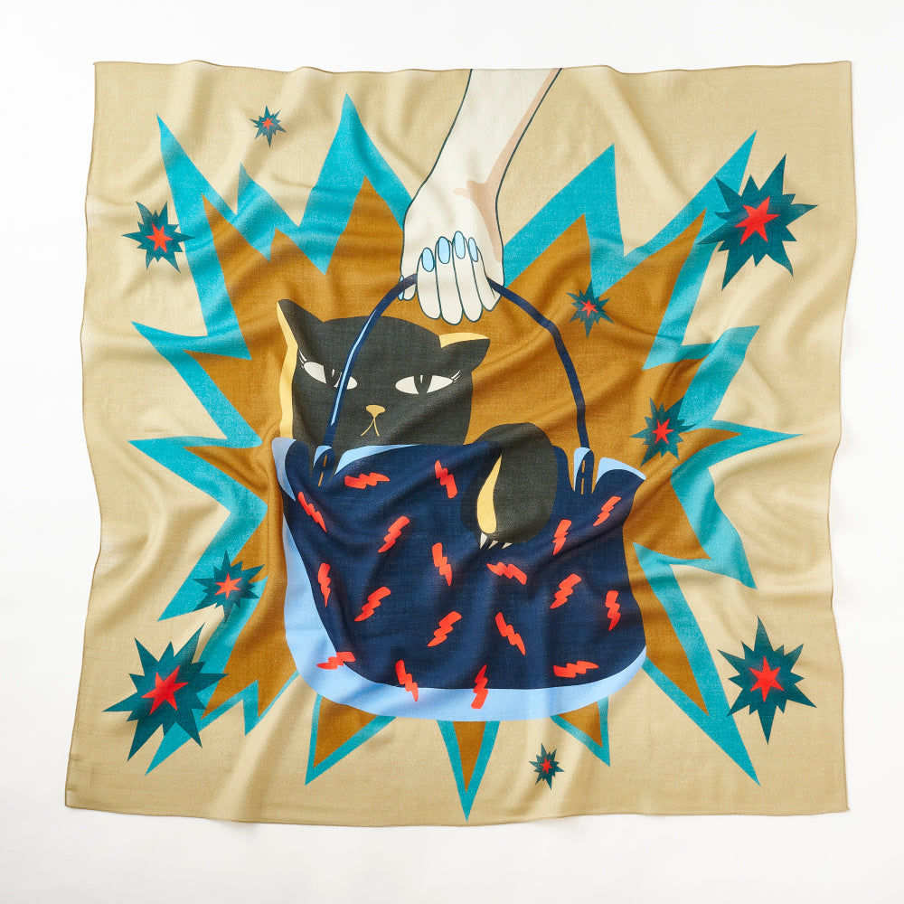 Écharpe Carrée Rose 'Chats Mystérieux' en Laine Mérinos Japonaise