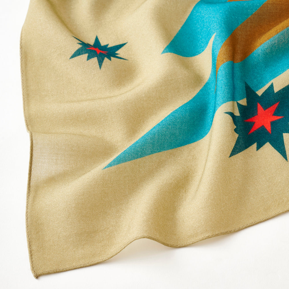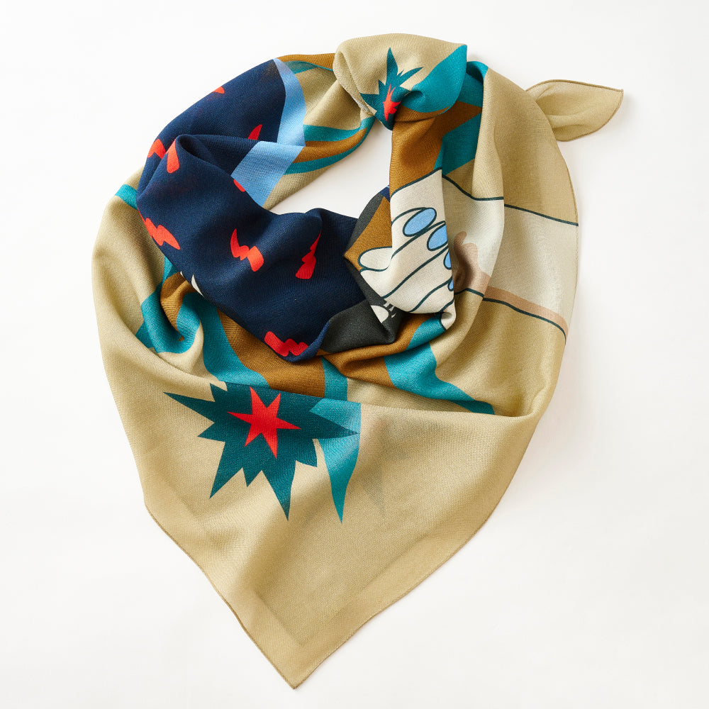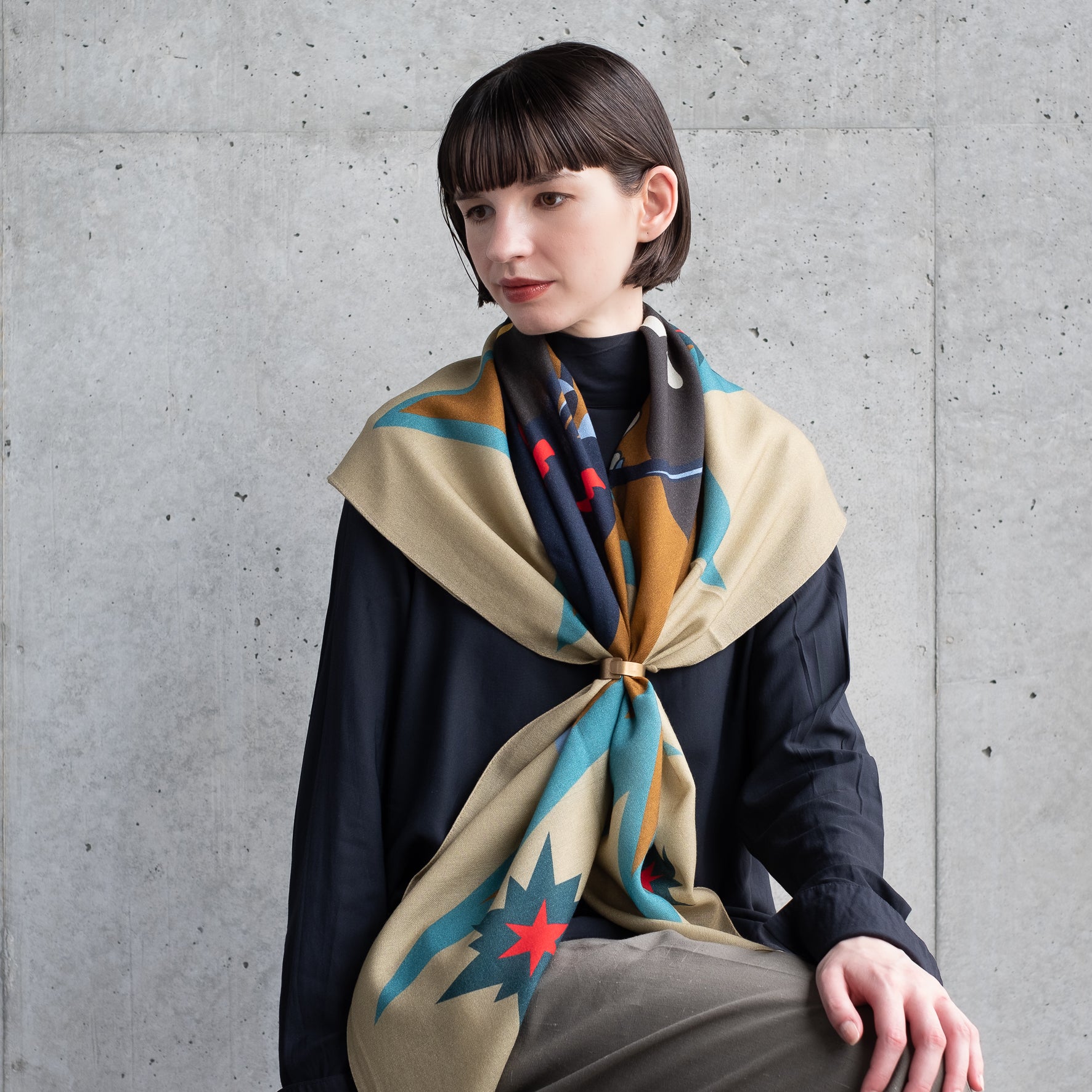 Une grande écharpe carrée qui peut être portée aussi bien par les hommes que par les femmes.