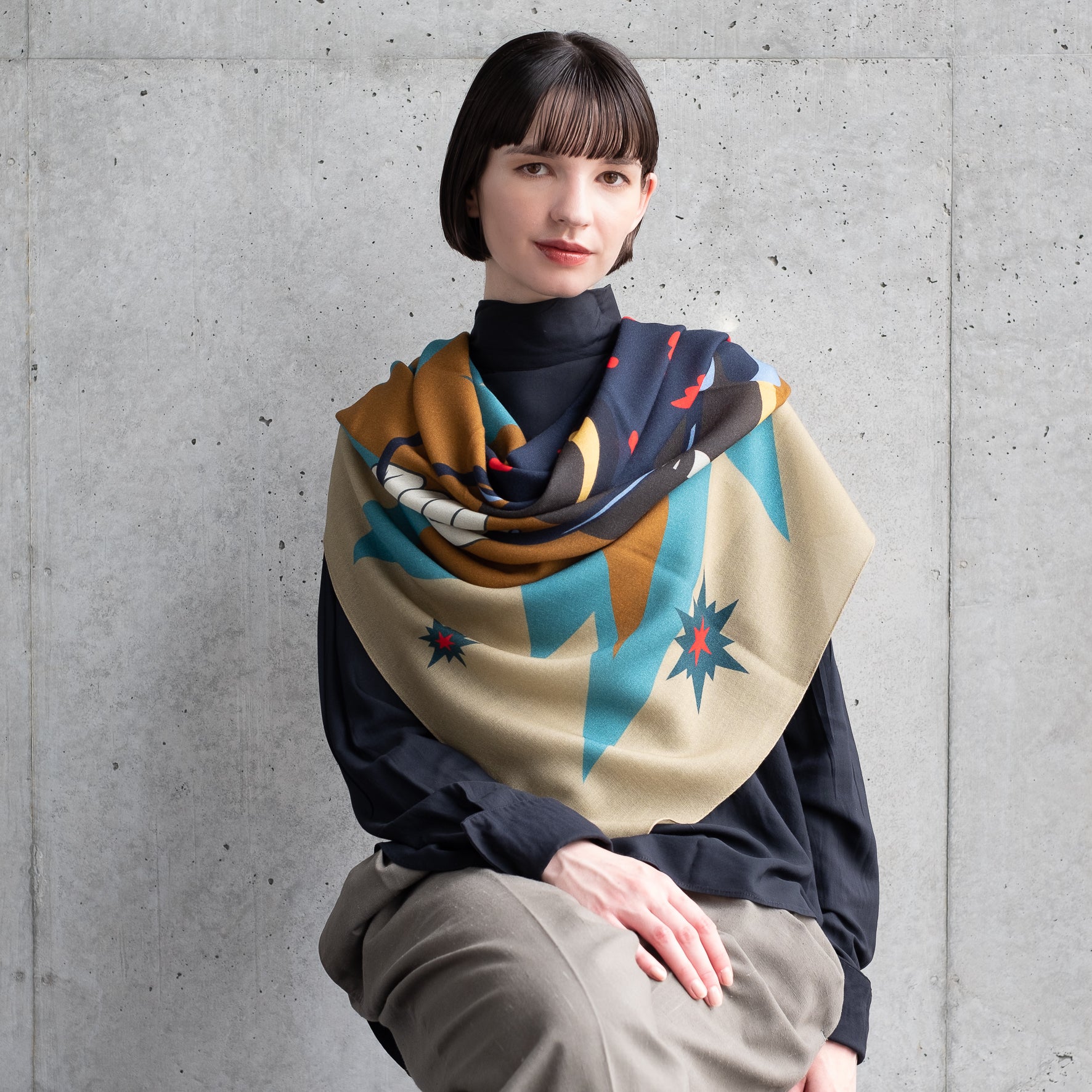 Une grande écharpe carrée en laine mérinos douce et délicate soigneusement tissée à Bishu (Aichi).