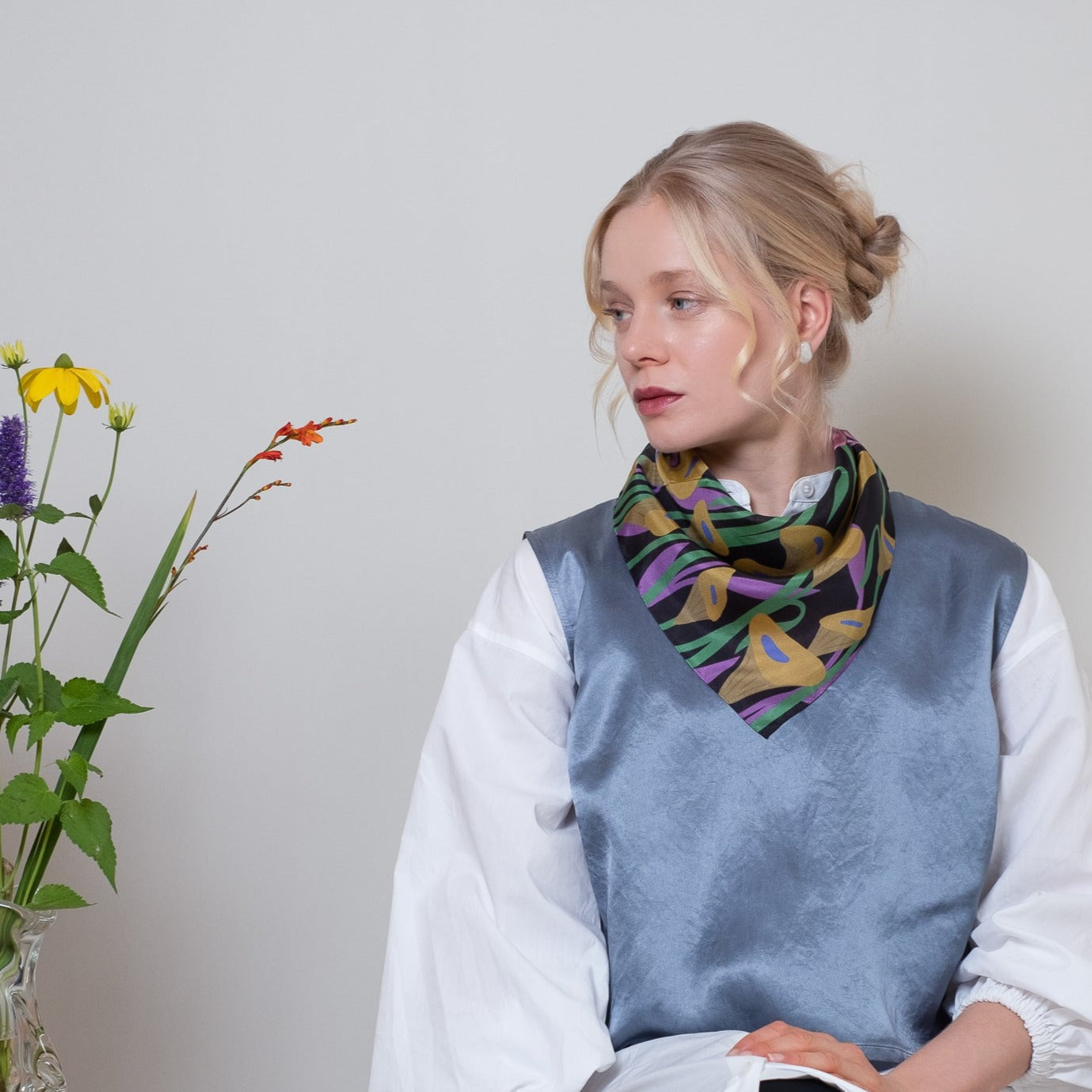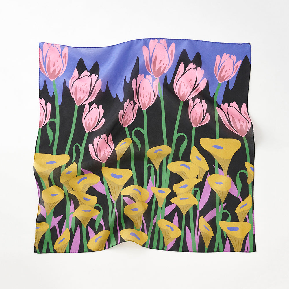Silk 'Tulips' black スカーフリング付きミニスカーフ
