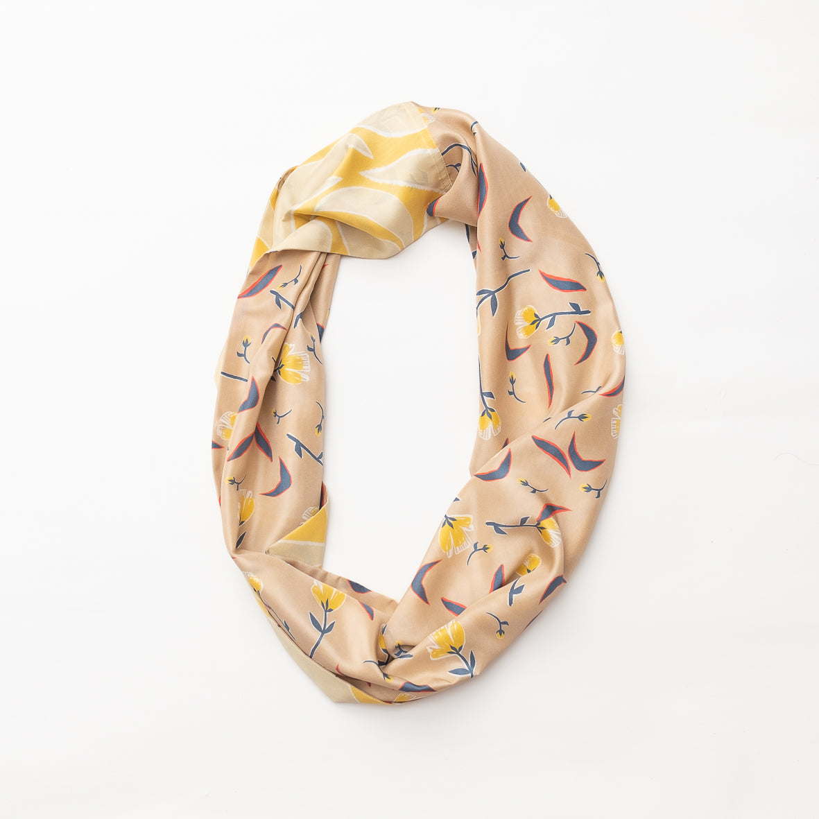表と裏、違う柄が組み合わさった、上品な艶のシルクのループスカーフ(スヌード)。シルクなので、夏以外の3シーズン使って頂けます。