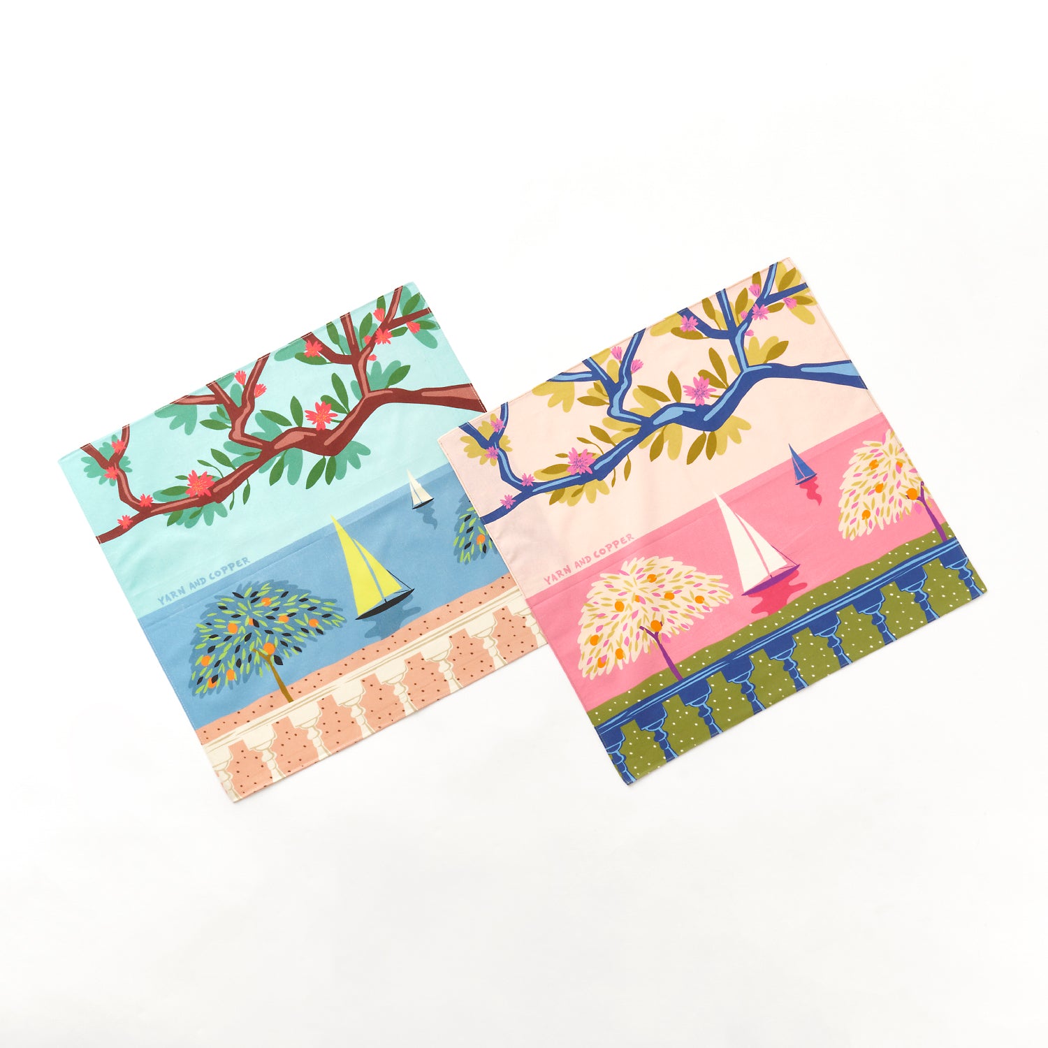 With an ocean view, sailing boats and citrus fruit trees are the main focal points. A beautiful mediterranean scene that is Summery, fresh and bright. You can almost smell the sea air as it travels on the ocean breeze.