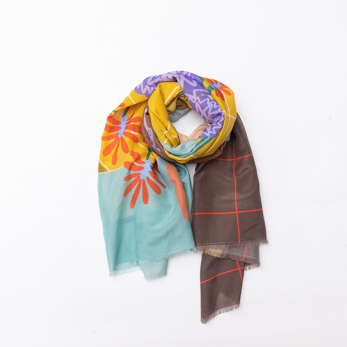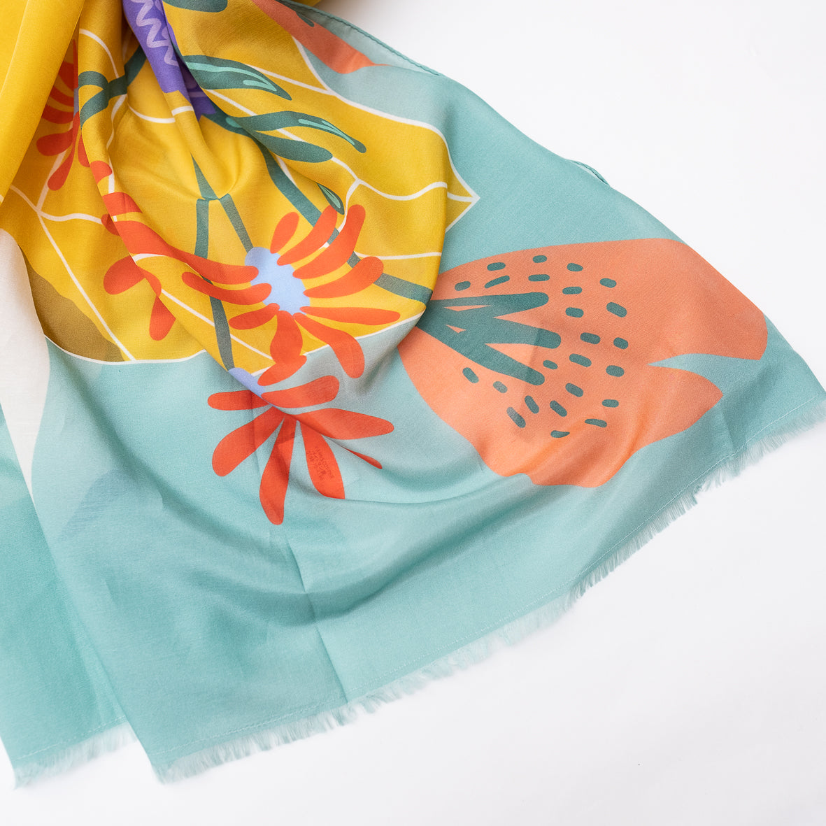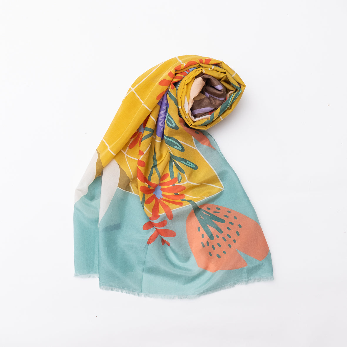 The concept behind this design is set in a florist's studio/shop. She has taken a break and you happen to walk in and see one of her beautiful flower arrangements. One side is a detailed illustration with bright flowers. The other side is more pattern based and when worn gives a a nice blend of illustration and pattern.