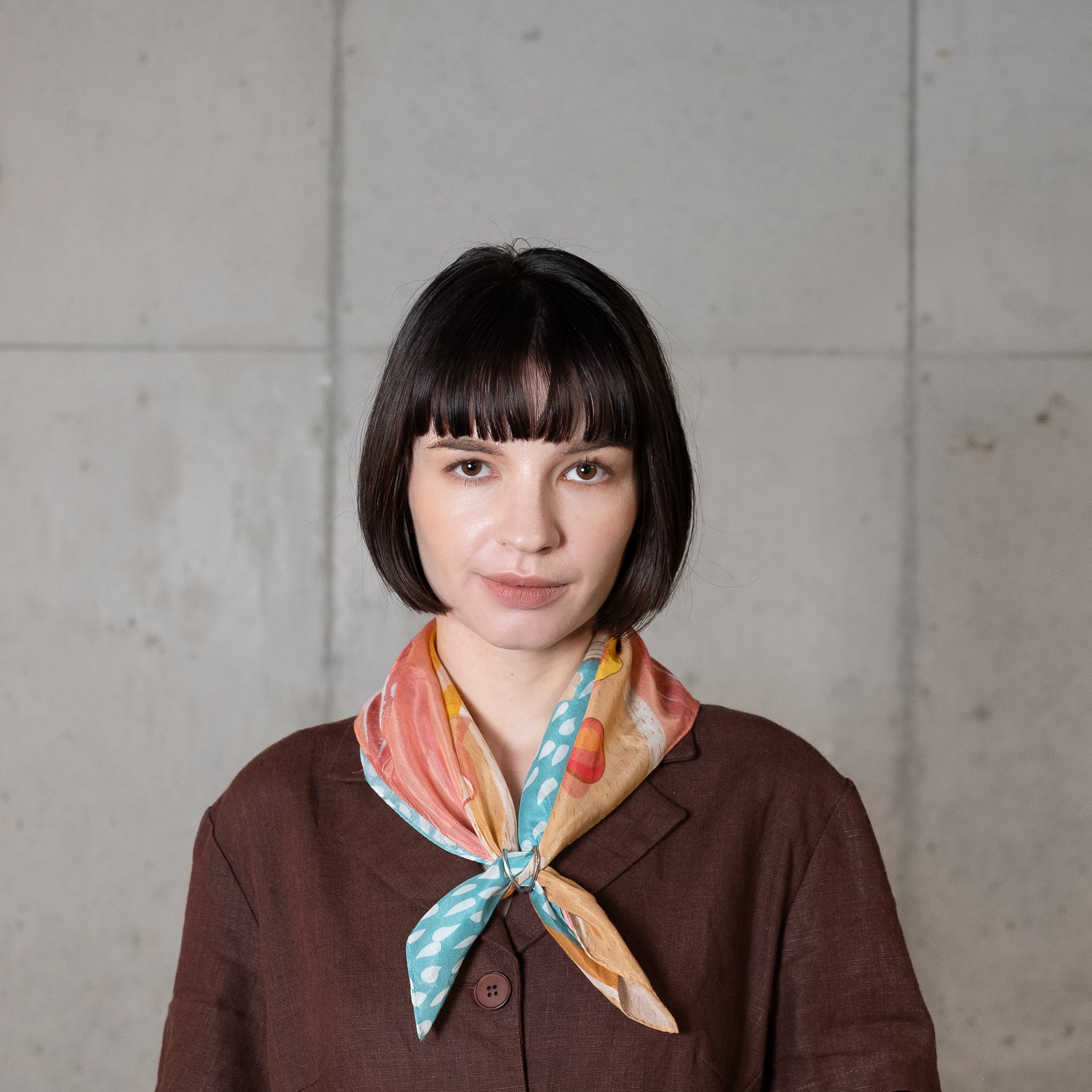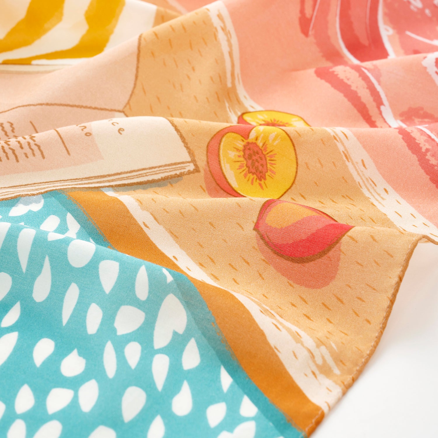 イラストレーションやパターンなどをミックスし、時にクラシックで、時にポップでクスッと笑ってしまうような、独自のアートスタイルを1枚のスカーフにしています。