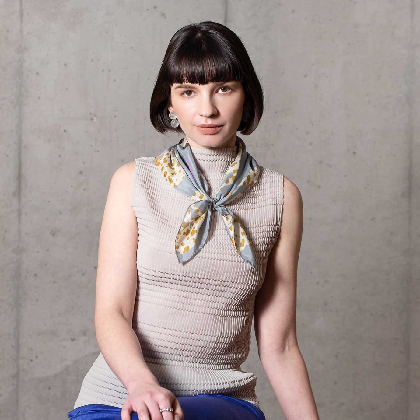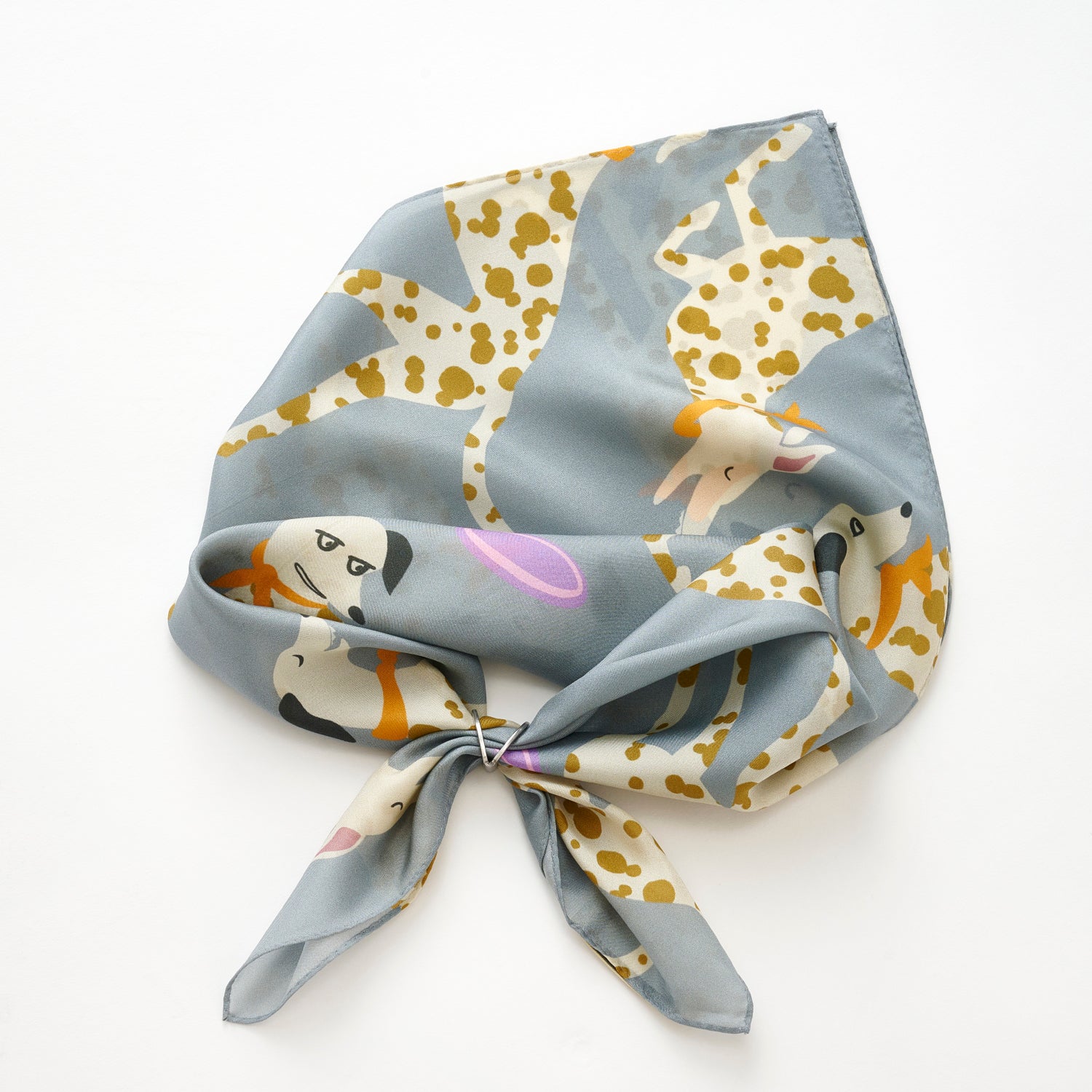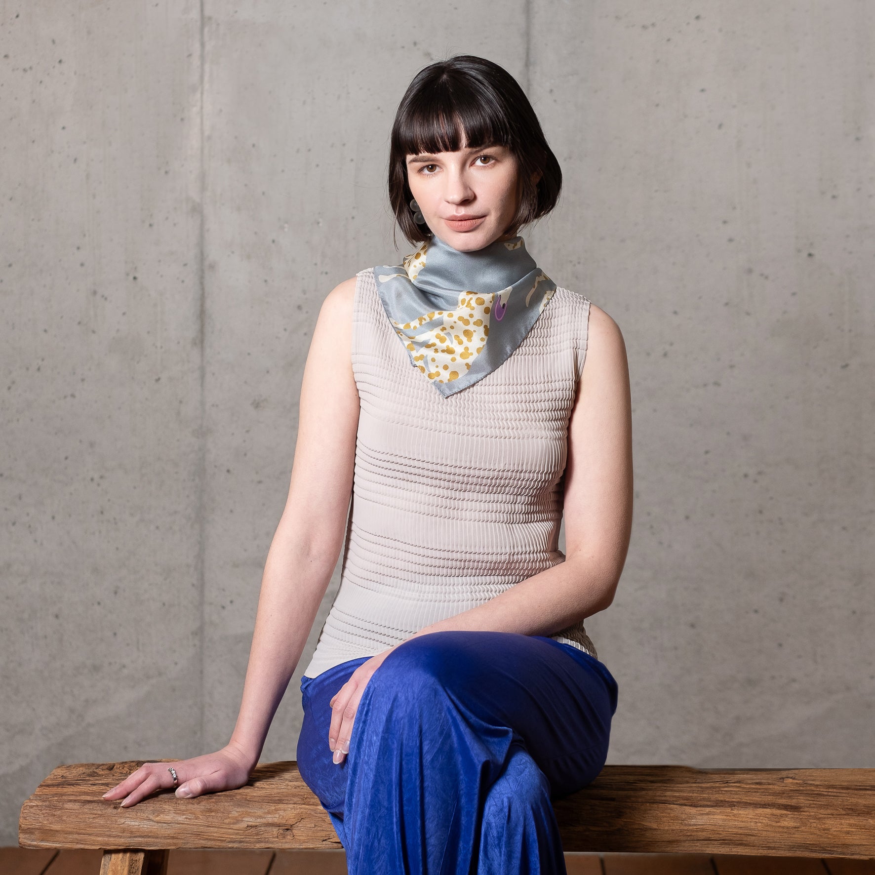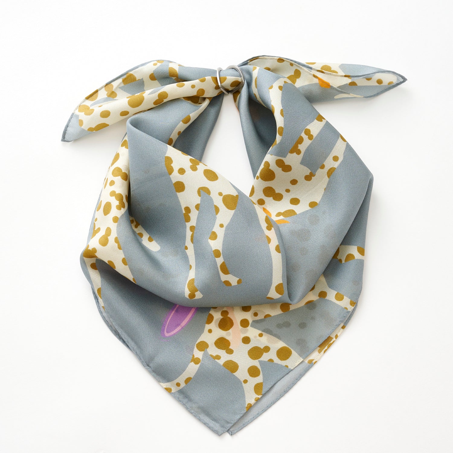 Un mini foulard (foulard) en soie qui peut être agencé avec un anneau de foulard ondulé en laiton.