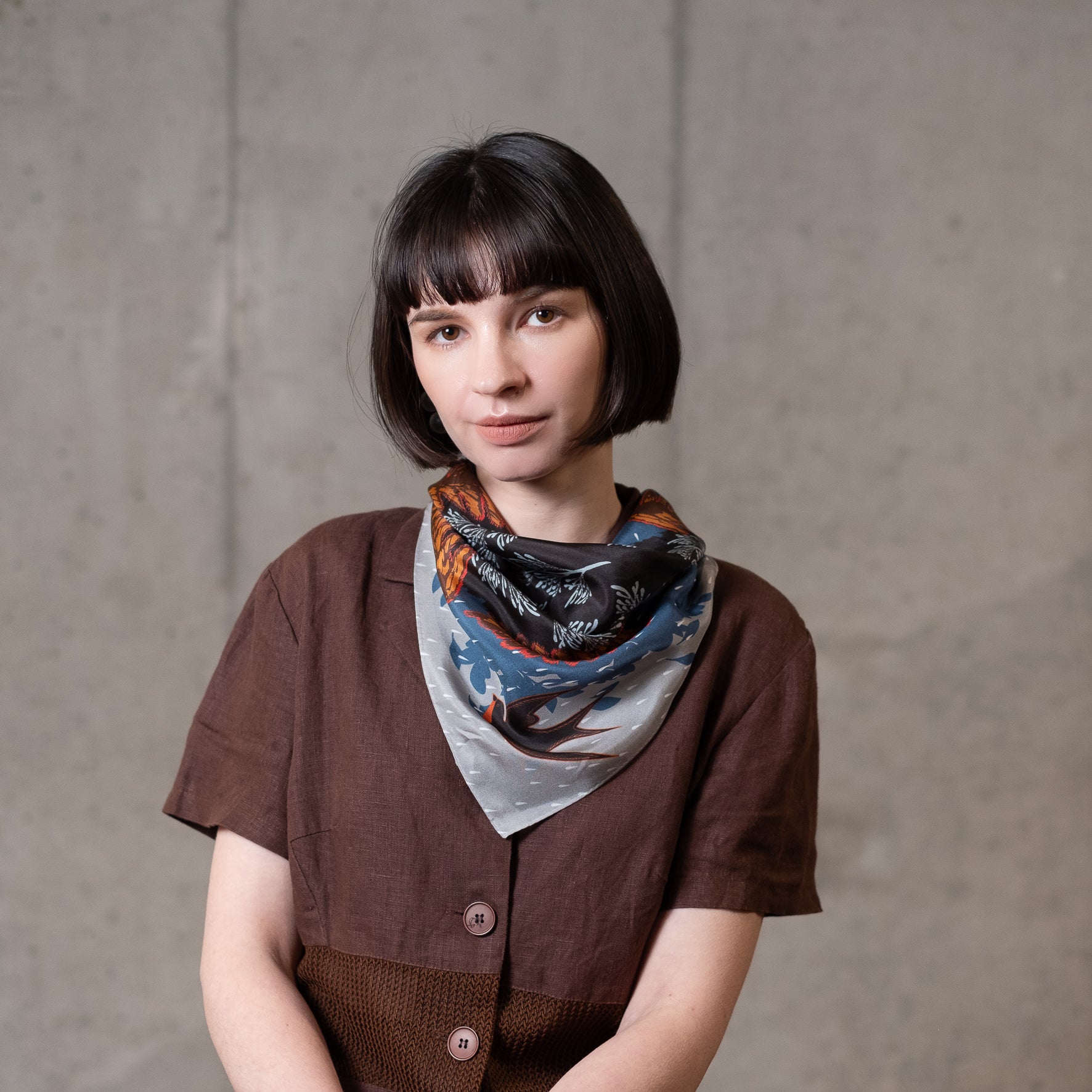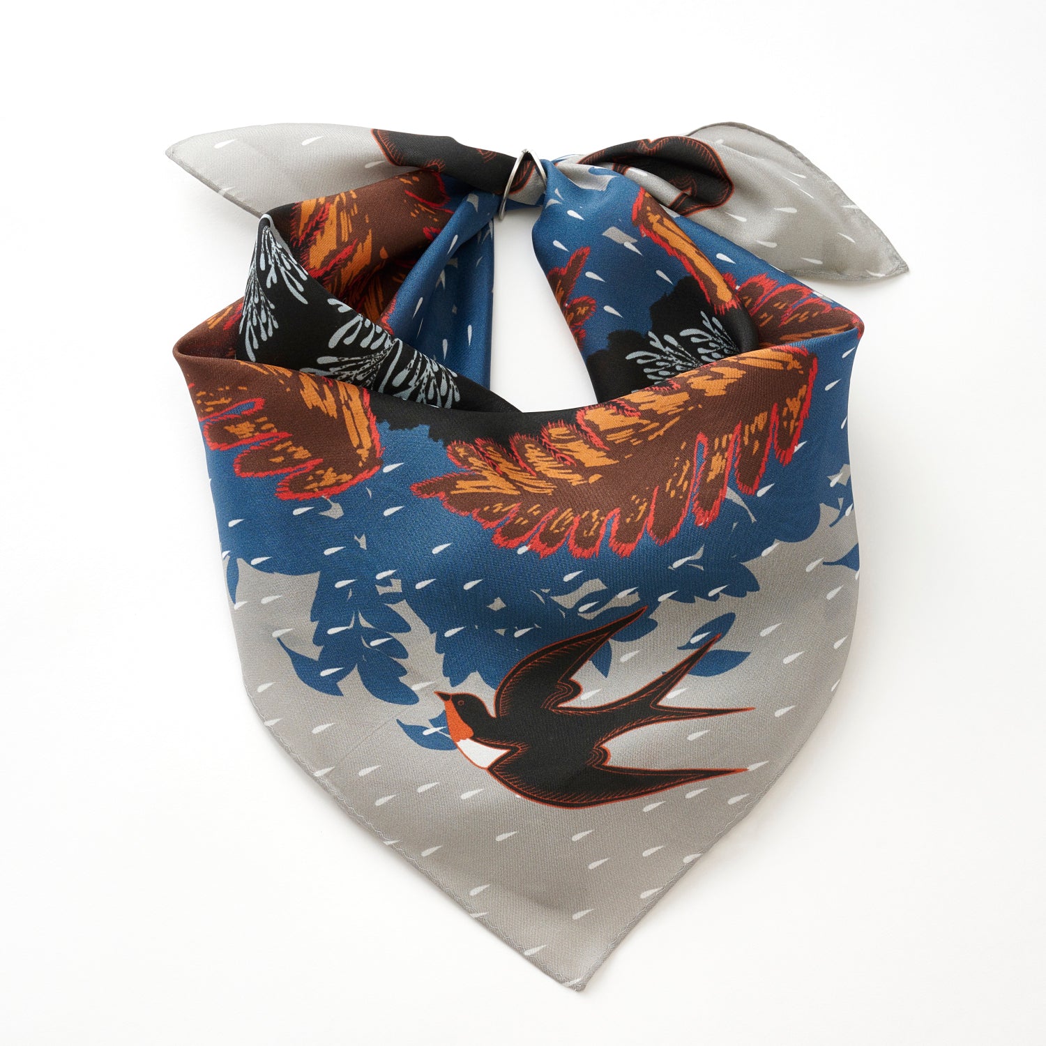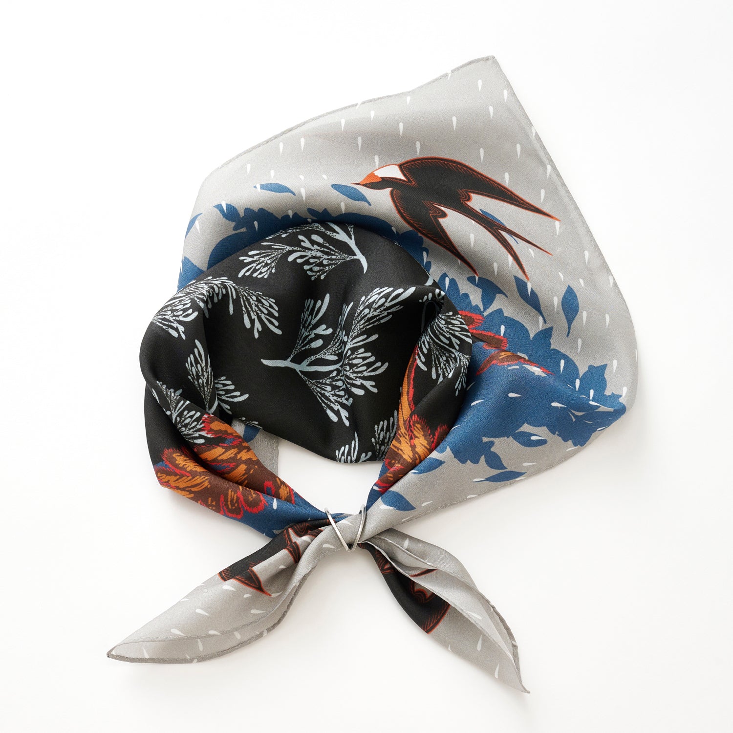 Un mini foulard (foulard) en soie qui peut être agencé avec un anneau de foulard ondulé en laiton.
