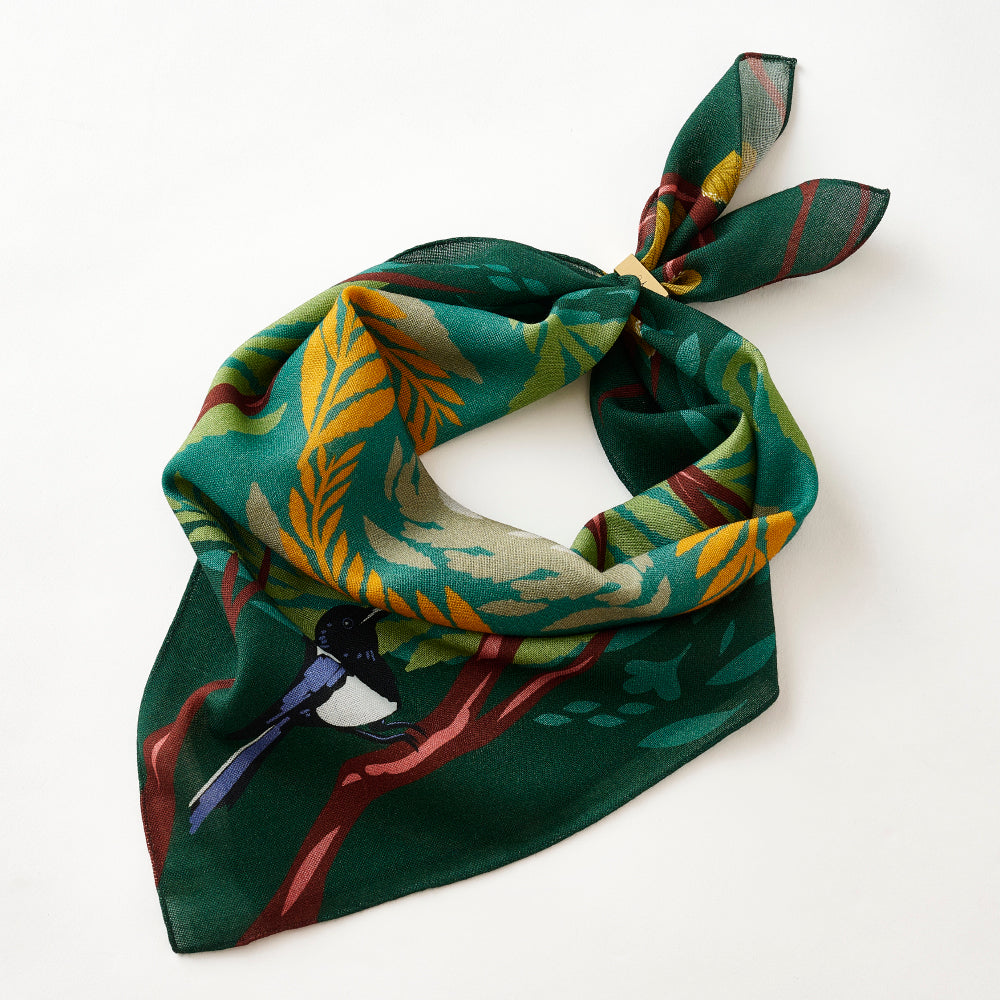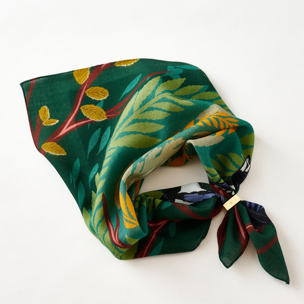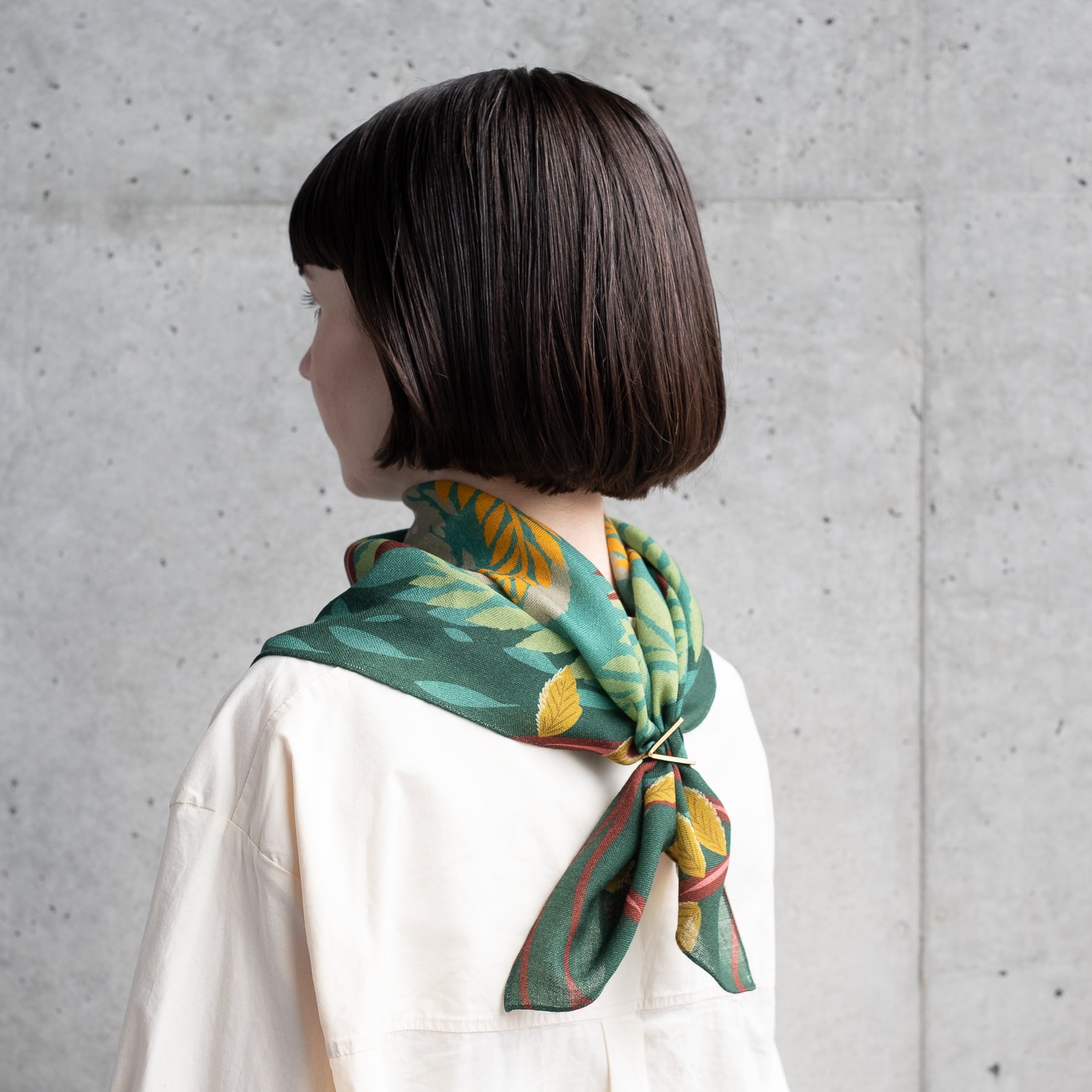 Un mini foulard (foulard) en soie qui peut être agencé avec un anneau de foulard ondulé en laiton.