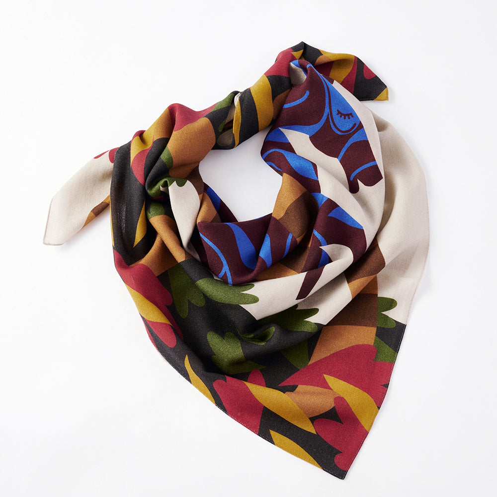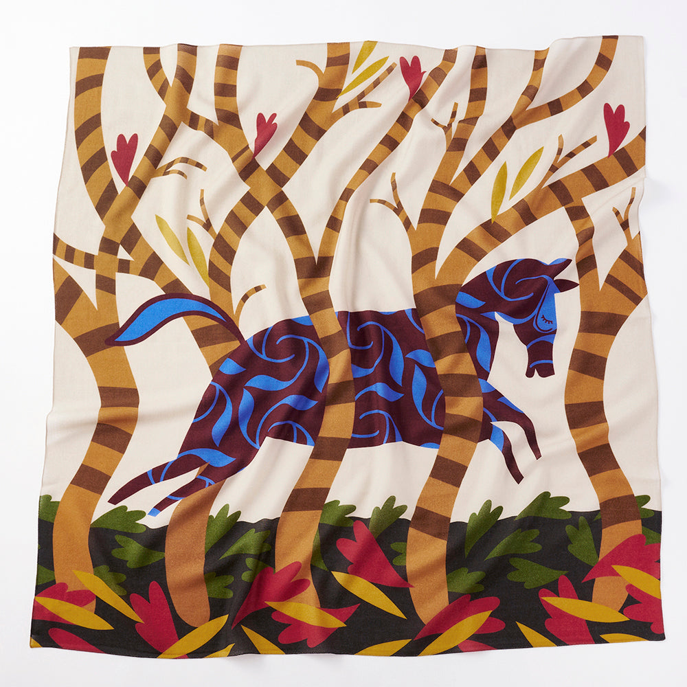 'Meadow Dancer' Illustrates the idea of a horse finding itself alone enjoying a moment of freedom. Happily dancing among the crisp fallen autumnal leaves with a fairytale like quality. The design has lines going through trees that create a beautiful pattern when worn. The horse is a flash of color in the centre with a decorative pattern for it's coat.