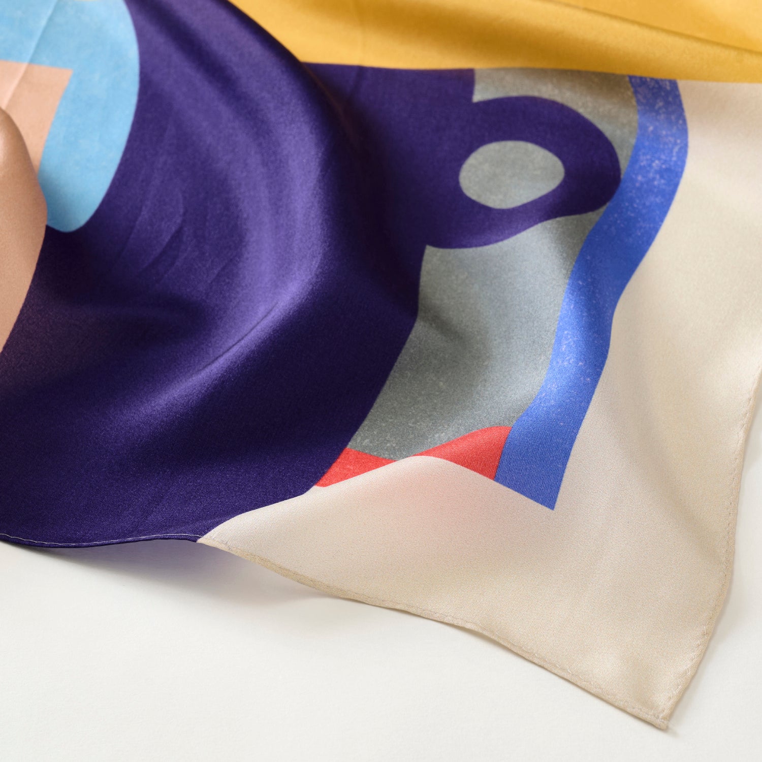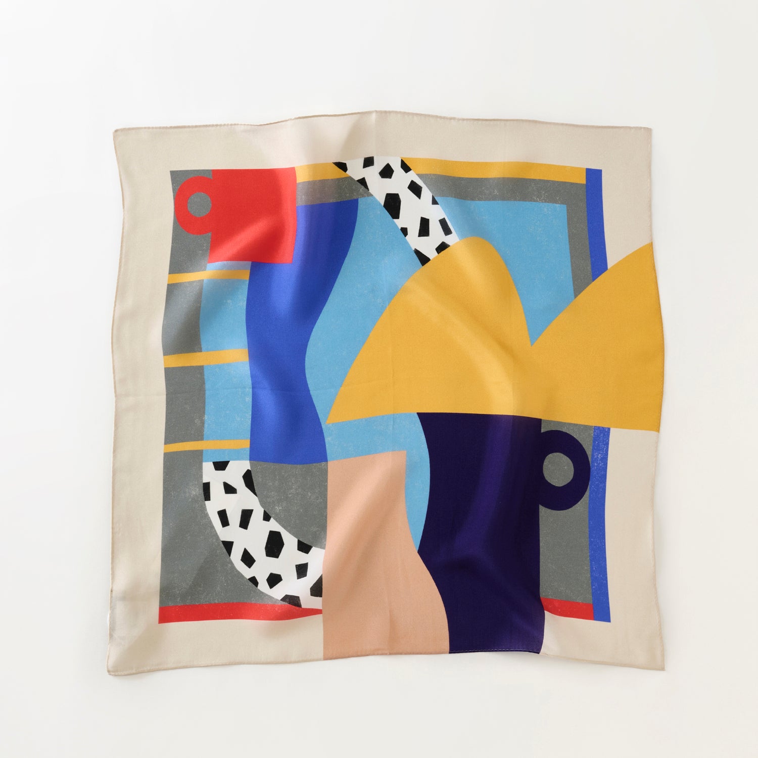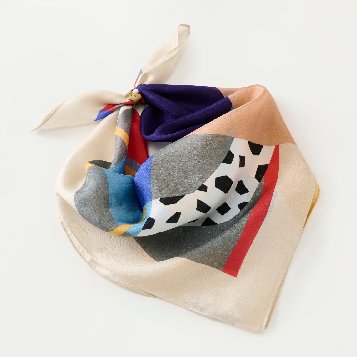 イラストレーションやパターンなどをミックスし、時にクラシックで、時にポップでクスッと笑ってしまうような、独自のアートスタイルを1枚のスカーフにしています。