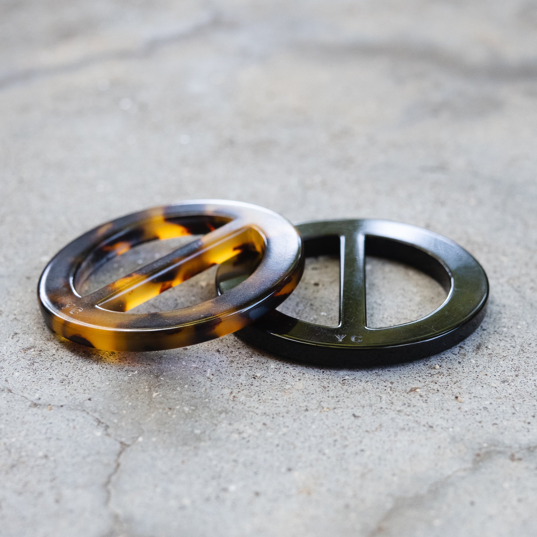 シンプルで大きめのサークル型リング。 使い勝手の良い黒と、印象的な鼈甲調の2カラー展開。