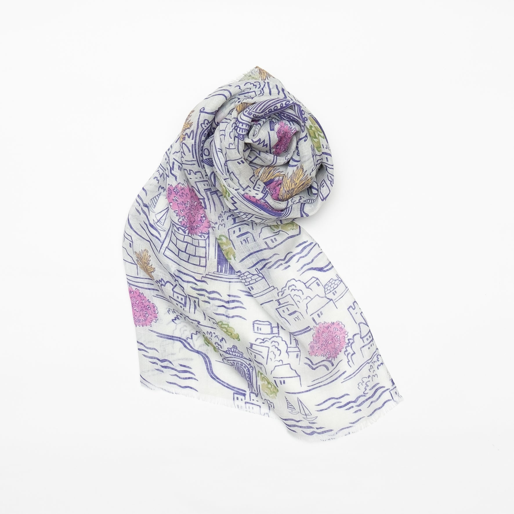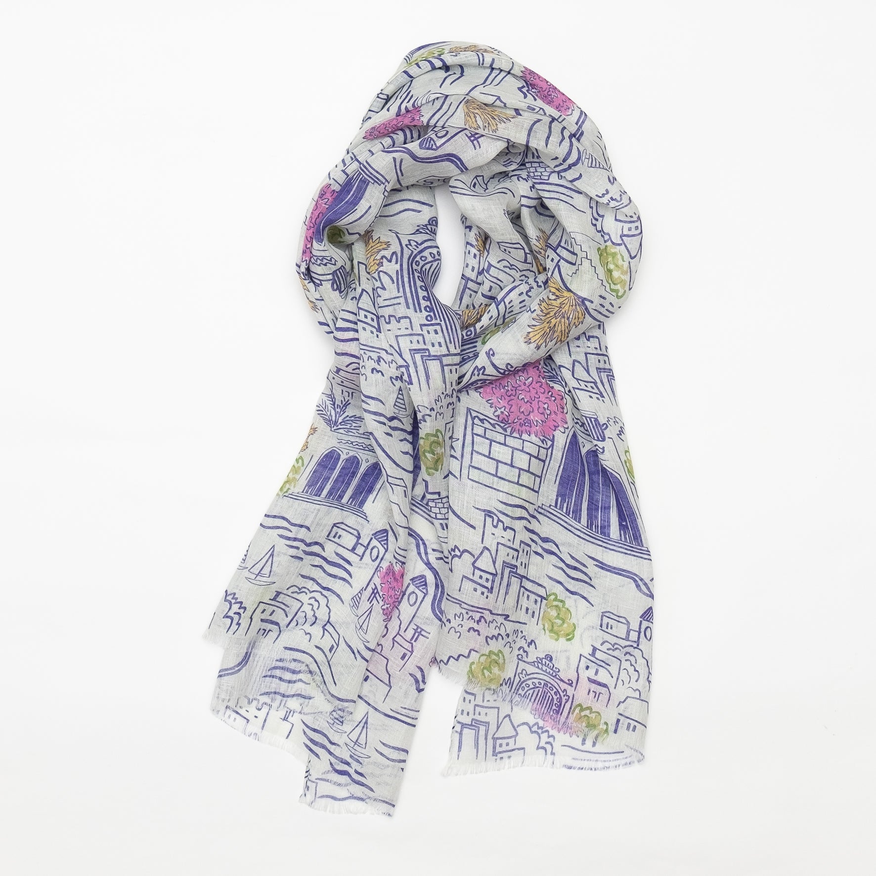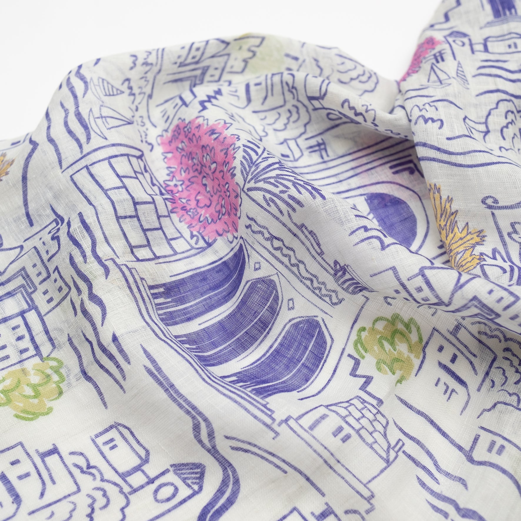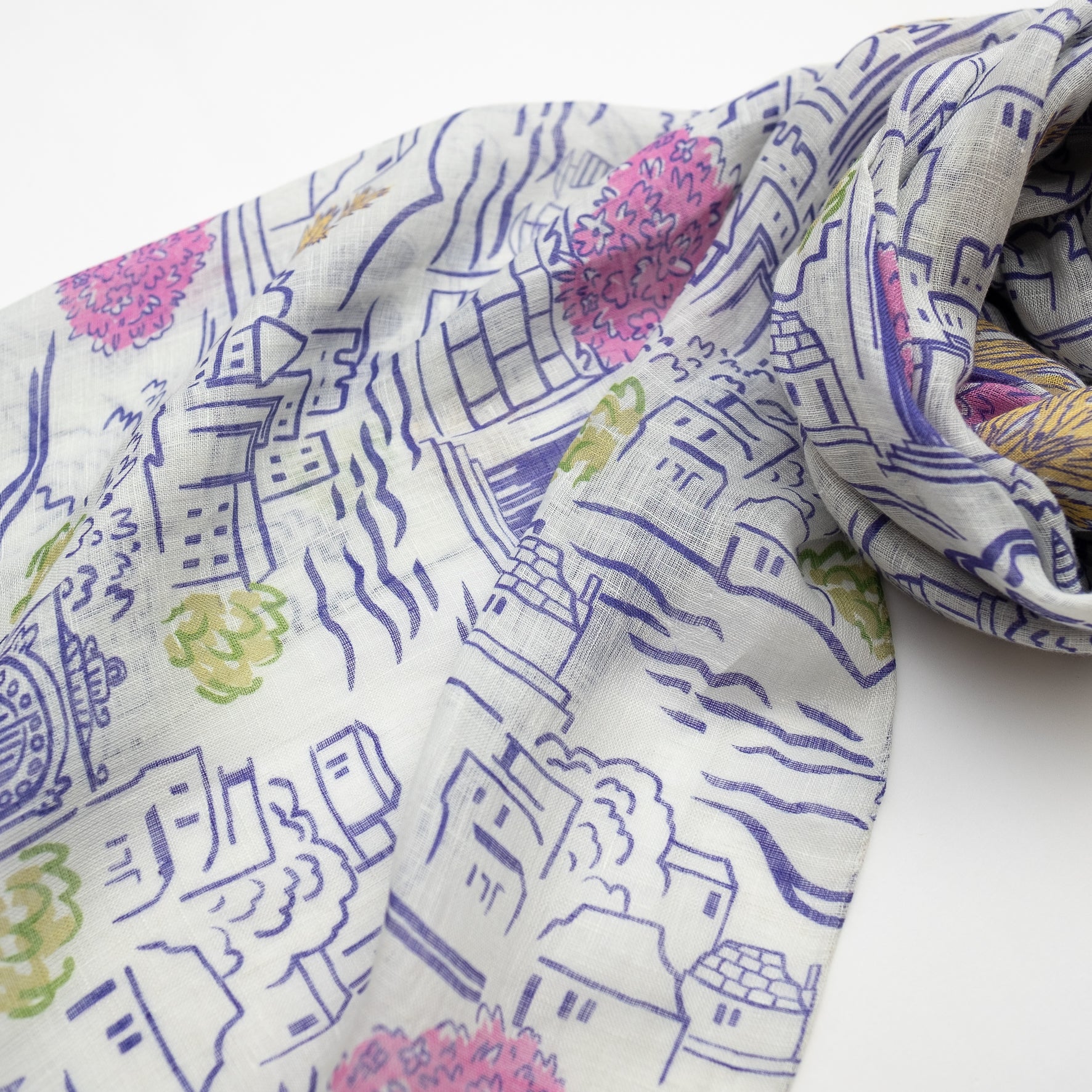 イラストレーションやパターンなどをミックスし、時にクラシックで、時にポップでクスッと笑ってしまうような、独自のアートスタイルを1枚のスカーフにしています。