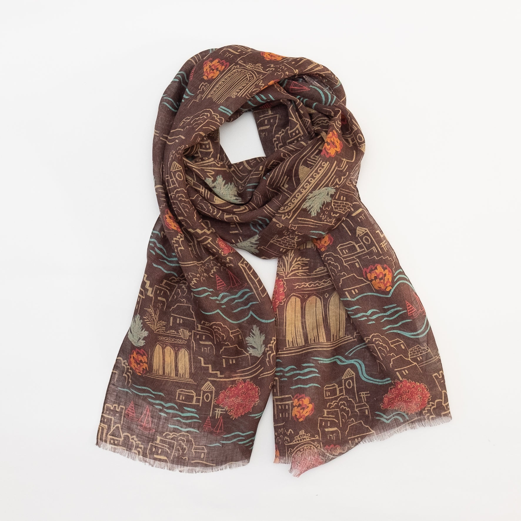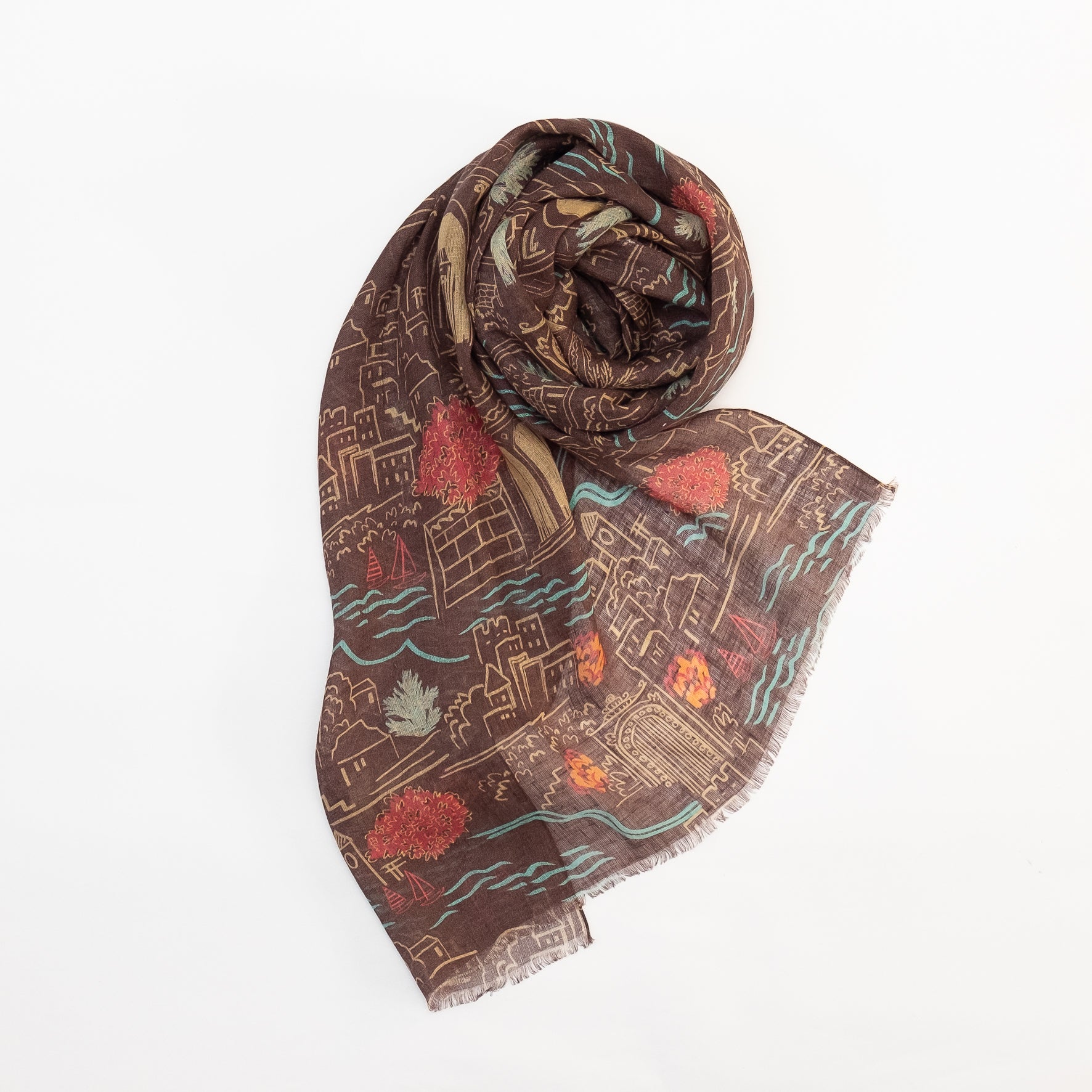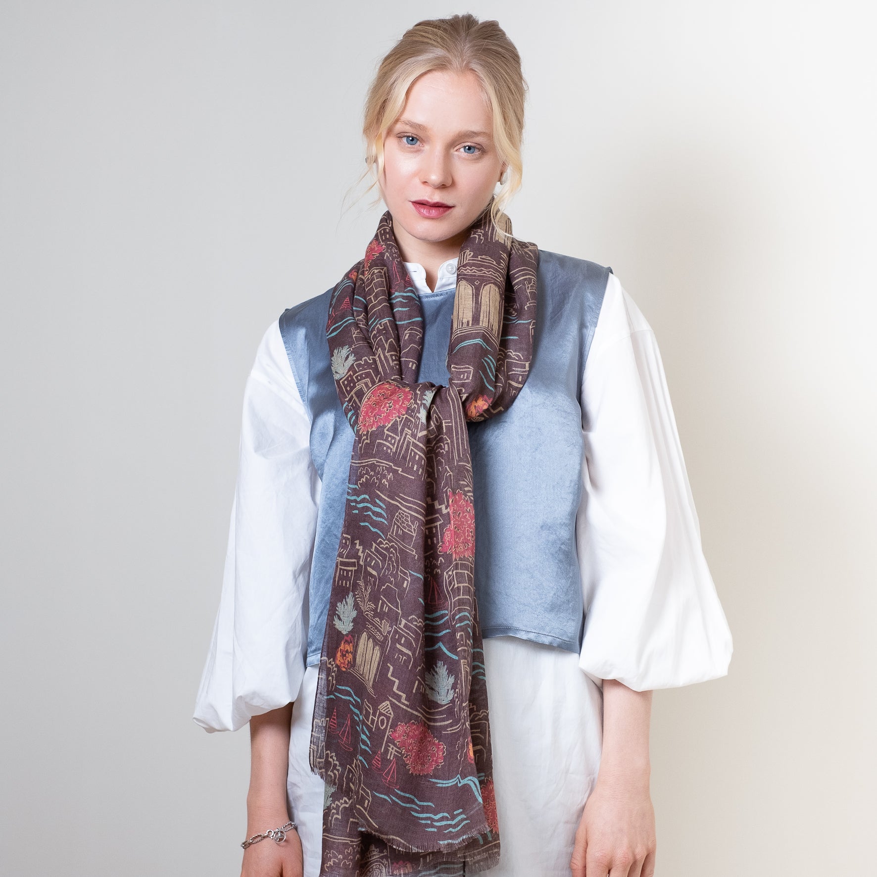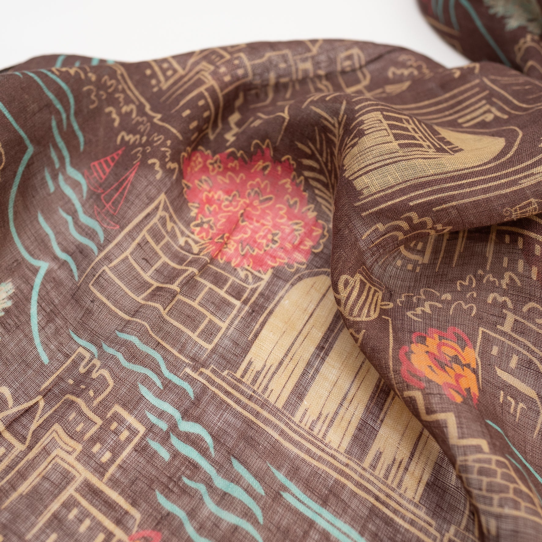 イラストレーションやパターンなどをミックスし、時にクラシックで、時にポップでクスッと笑ってしまうような、独自のアートスタイルを1枚のスカーフにしています。