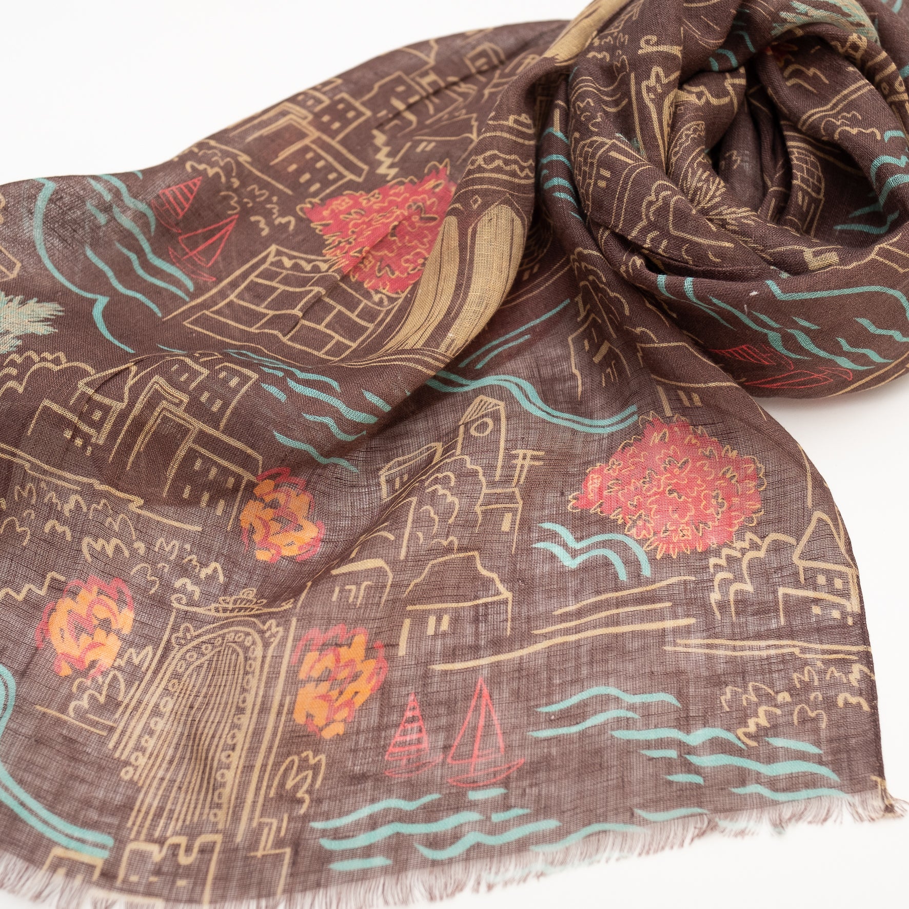 Châteaux is a design made up of a sprawling old town in the South of France. Churches, building, houses and plants can be seen amongst the pattern. The town is an imaginary place, that resembles the architecture of the Southern areas of France. Waves give the design some alternative colour and also break up the design.