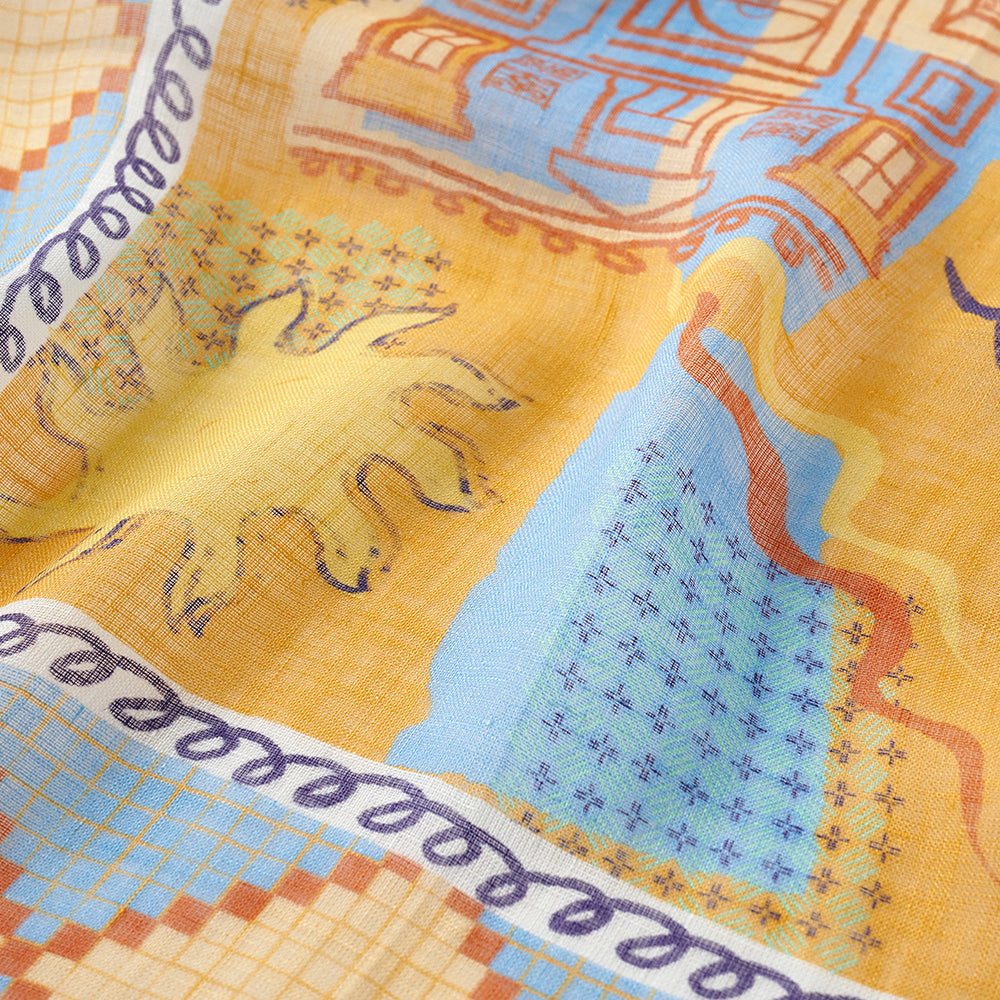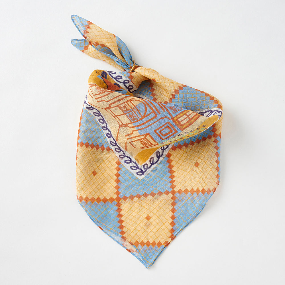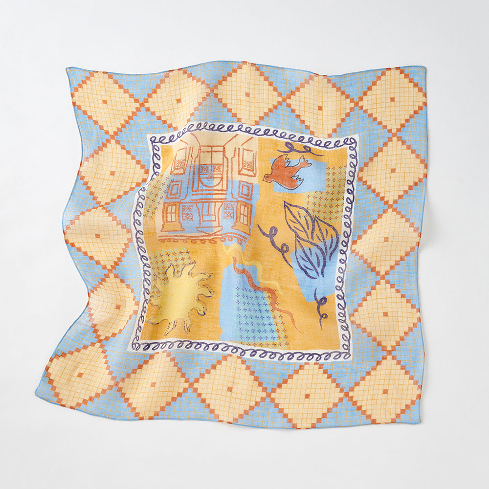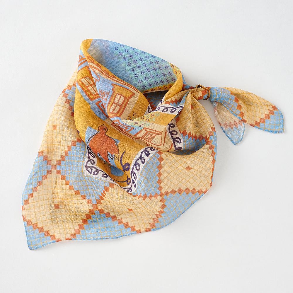 イラストレーションやパターンなどをミックスし、時にクラシックで、時にポップでクスッと笑ってしまうような、独自のアートスタイルを1枚のスカーフにしています。