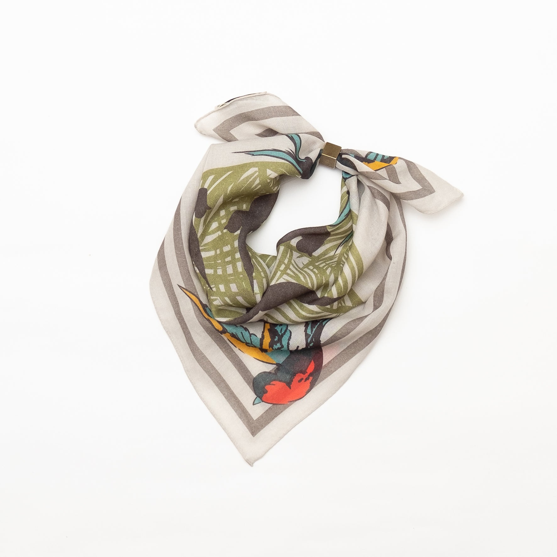 スカーフのデザインがステキなのと、スカーフの折り方によって違う雰囲気が出ていろんな服で楽しめます。
