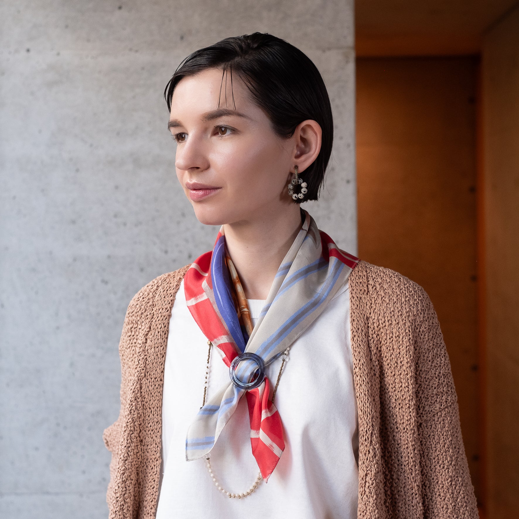 首元にさっと彩りを添えるだけで、